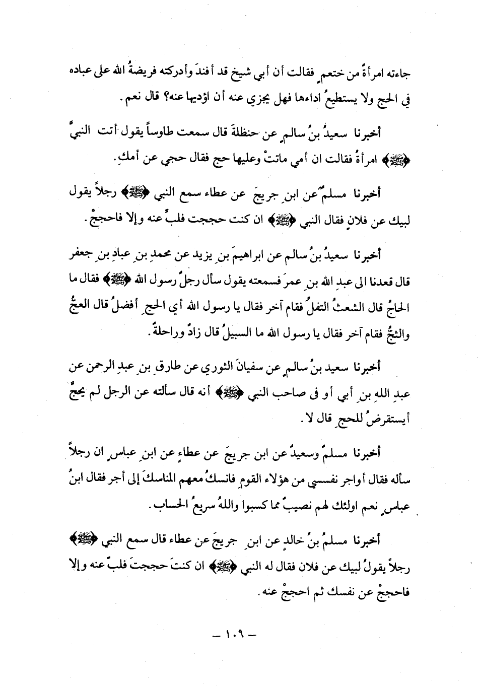 أَخْبَرَنَا سَعِيدُ بْنُ سَالِمٍ، عَنْ حَنْظَلَةَ قَالَ: سَمِعْتُ طَاوُسًا، يَقُولُ: أَتَتِ النَّبِيَّ صَلَّى اللهُ عَلَيْهِ وَسَلَّمَ امْرَأَةٌ فَقَالَتْ: إِنَّ أُمِّي مَاتَتْ وَعَلَيْهَا حَجٌّ، فَقَالَ: «§حُجِّي عَنْ أُمِّكِ»