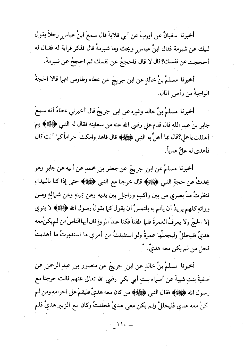 أَخْبَرَنَا مُسْلِمُ بْنُ خَالِدٍ، عَنِ ابْنِ جُرَيْجٍ، عَنْ مَنْصُورِ بْنِ عَبْدِ الرَّحْمَنِ، عَنْ صَفِيَّةَ بِنْتِ شَيْبَةَ، عَنْ أَسْمَاءَ بِنْتِ أَبِي بَكْرٍ، رَضِيَ اللَّهُ تَعَالَى عَنْهُمْ قَالَتْ: خَرَجْنَا مَعَ رَسُولِ اللَّهِ صَلَّى اللهُ عَلَيْهِ وَسَلَّمَ فَقَالَ النَّبِيُّ صَلَّى اللهُ عَلَيْهِ وَسَلَّمَ: «§مَنْ كَانَ مَعَهُ هَدْيٌ فَلْيَقُمْ عَلَى إِحْرَامِهِ، وَمَنْ لَمْ يَكُنْ مَعَهُ هَدْيٌ فَلْيَحْلِلْ». وَلَمْ يَكُنْ مَعِي هَدْيٌ فَحَلَلْتُ، وَكَانَ مَعَ الزُّبَيْرِ هَدْيٌ فَلَمْ -[111]- يَحْلِلْ