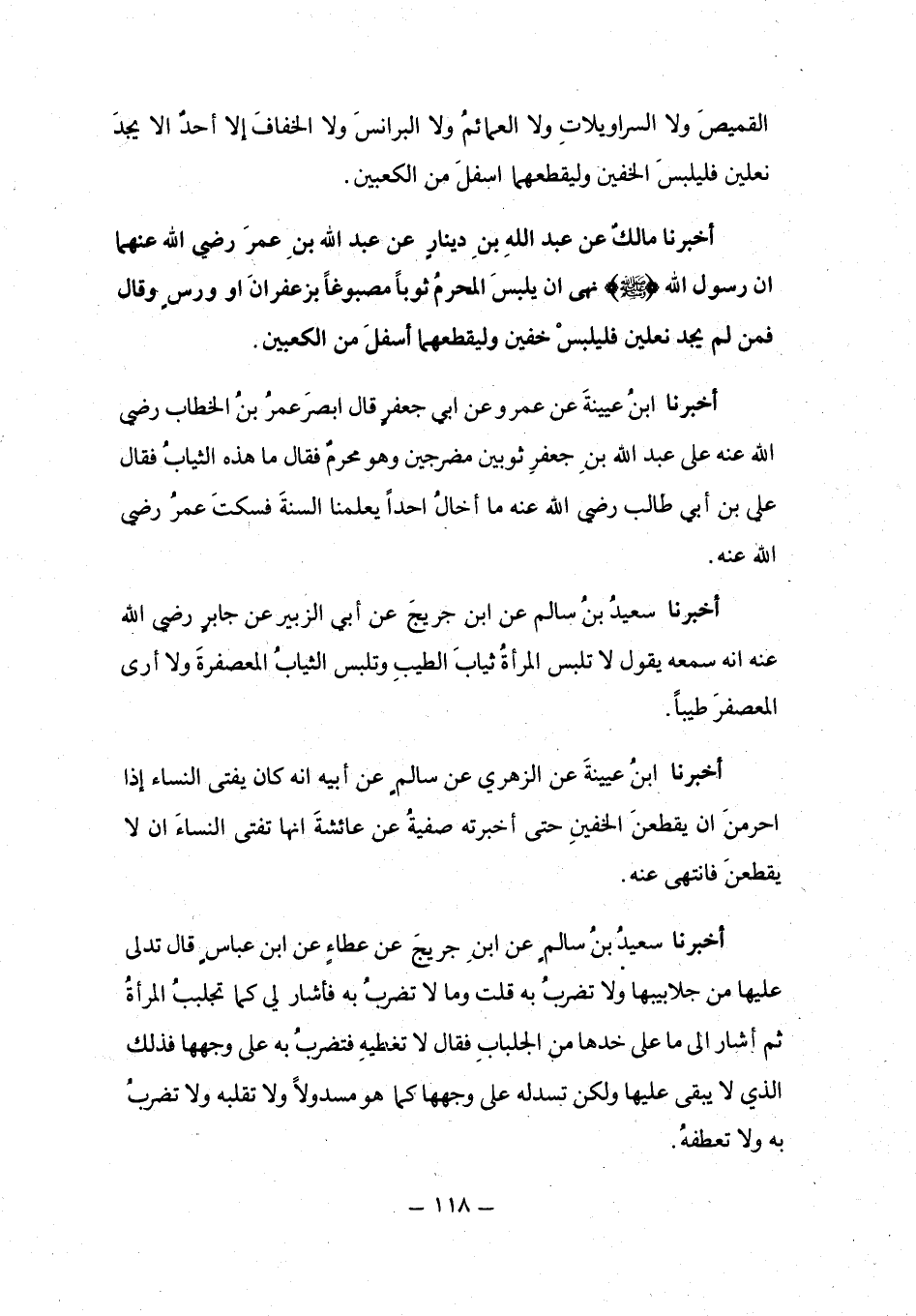 أَخْبَرَنَا مَالِكٌ، عَنْ عَبْدِ اللَّهِ بْنِ دِينَارٍ، عَنْ عَبْدِ اللَّهِ بْنِ عُمَرَ رَضِيَ اللَّهُ عَنْهُمَا أَنَّ رَسُولَ اللَّهِ صَلَّى اللهُ عَلَيْهِ وَسَلَّمَ نَهَى أَنْ يَلْبَسَ الْمُحْرِمُ ثَوْبًا مَصْبُوغًا بِزَعْفَرَانٍ أَوْ وَرْسٍ، وَقَالَ: «§فَمَنْ لَمْ يَجِدْ نَعْلَيْنِ فَلْيَلْبَسْ خُفَّيْنِ، وَلْيَقْطَعْهُمَا أَسْفَلَ مِنَ الْكَعْبَيْنِ»