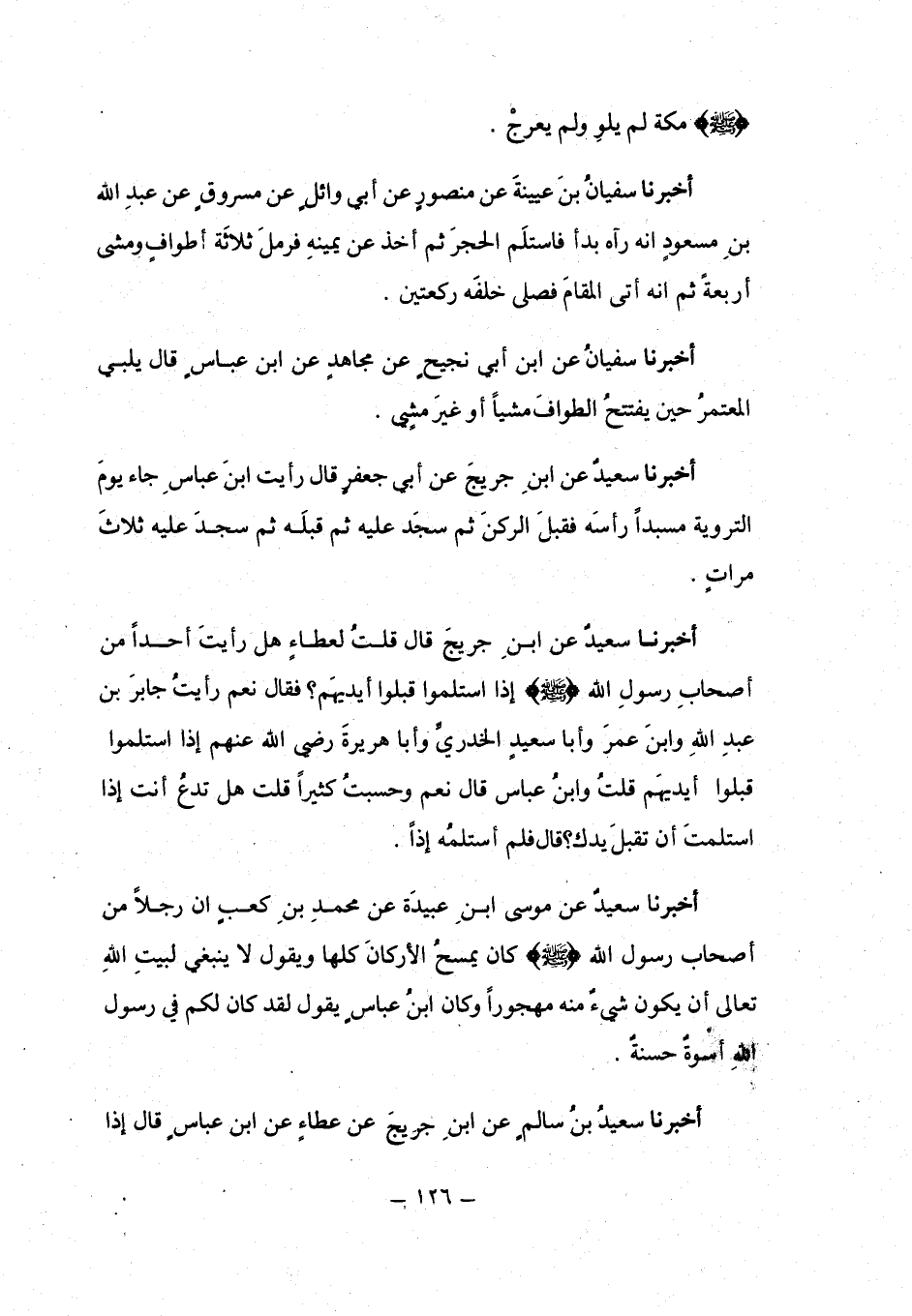 أَخْبَرَنَا سَعِيدٌ، عَنِ ابْنِ جُرَيْجٍ، عَنْ أَبِي جَعْفَرٍ قَالَ: «رَأَيْتُ ابْنَ عَبَّاسٍ §جَاءَ يَوْمَ التَّرْوِيَةِ مُسَبِّدًا رَأْسَهُ، فَقَبَّلَ الرُّكْنَ ثُمَّ سَجَدَ عَلَيْهِ، ثُمَّ قَبَّلَهُ ثُمَّ سَجَدَ عَلَيْهِ، ثَلَاثَ مَرَّاتٍ»