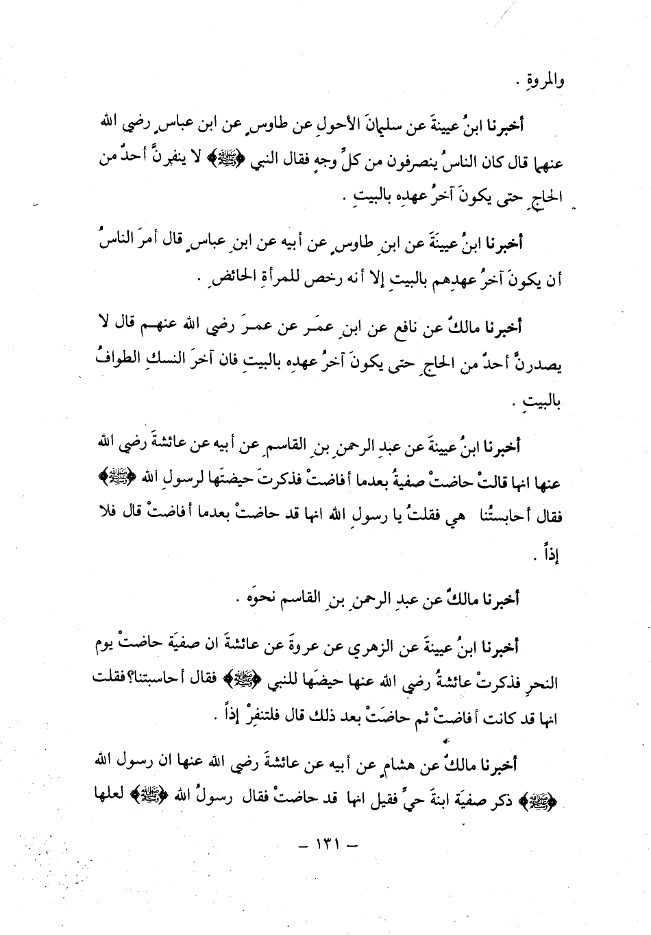 أَخْبَرَنَا ابْنُ عُيَيْنَةَ، عَنْ عَبْدِ الرَّحْمَنِ بْنِ الْقَاسِمِ، عَنْ أَبِيهِ، عَنْ عَائِشَةَ رَضِيَ اللَّهُ عَنْهَا أَنَّهَا قَالَتْ: حَاضَتْ صَفِيَّةُ بَعْدَمَا أَفَاضَتْ، فَذَكَرْتُ حَيْضَتَهَا لِرَسُولِ اللَّهِ صَلَّى اللهُ عَلَيْهِ وَسَلَّمَ فَقَالَ: «§أَحَابِسَتُنَا هِيَ؟» فَقُلْتُ: يَا رَسُولَ اللَّهِ، إِنَّهَا قَدْ حَاضَتْ بَعْدَمَا أَفَاضَتْ، قَالَ: «فَلَا إِذًا» أَخْبَرَنَا مَالِكٌ، عَنْ عَبْدِ الرَّحْمَنِ بْنِ الْقَاسِمِ، نَحْوَهُ