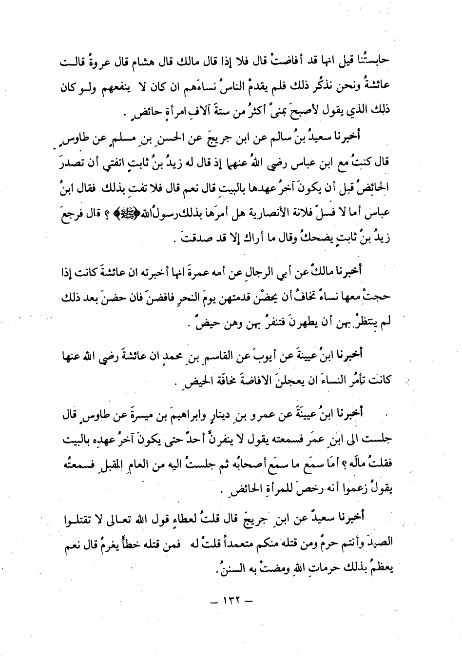 أَخْبَرَنَا ابْنُ عُيَيْنَةَ، عَنْ عَمْرِو بْنِ دِينَارٍ، وَإِبْرَاهِيمَ بْنِ مَيْسَرَةَ، عَنْ طَاوُسٍ قَالَ: جَلَسْتُ إِلَى ابْنِ عُمَرَ فَسَمِعْتُهُ يَقُولُ: " لَا يَنْفِرَنَّ أَحَدٌ حَتَّى يَكُونَ آخِرُ عَهْدِهِ بِالْبَيْتِ، فَقُلْتُ: مَا لَهُ؟ أَمَا سَمِعَ مَا سَمِعَ أَصْحَابُهُ؟ ثُمَّ جَلَسْتُ إِلَيْهِ مِنَ الْعَامِ الْمُقْبِلِ فَسَمِعْتُهُ يَقُولُ: §زَعَمُوا أَنَّهُ رُخِّصَ لِلْمَرْأَةِ الْحَائِضِ "