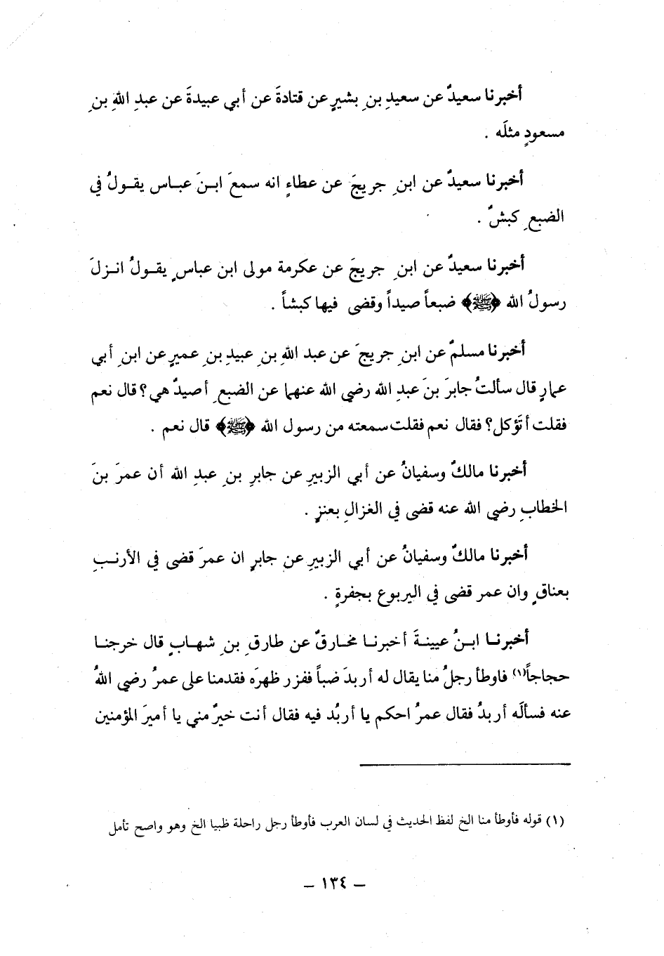 أَخْبَرَنَا سَعِيدٌ، عَنِ ابْنِ جُرَيْجٍ، عَنْ عِكْرِمَةَ مَوْلَى ابْنِ عَبَّاسٍ يَقُولُ: «§أَنْزَلَ رَسُولُ اللَّهِ صَلَّى اللهُ عَلَيْهِ وَسَلَّمَ ضَبُعًا صَيْدًا وَقَضَى فِيهَا كَبْشًا»