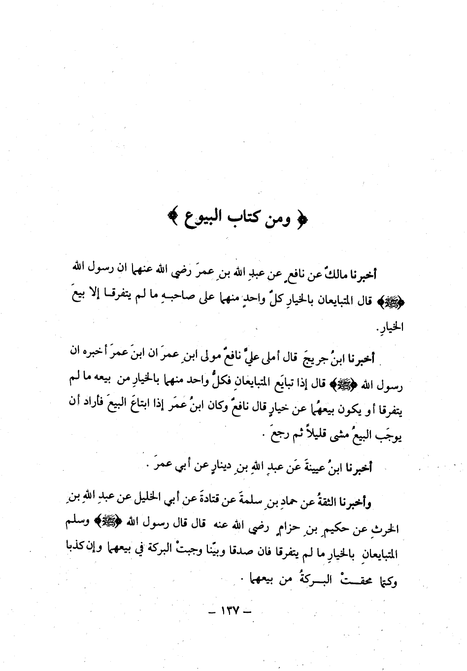 أَخْبَرَنَا مَالِكٌ، عَنْ نَافِعٍ، عَنْ عَبْدِ اللَّهِ بْنِ عُمَرَ رَضِيَ اللَّهُ عَنْهُمَا أَنَّ رَسُولَ اللَّهِ صَلَّى اللهُ عَلَيْهِ وَسَلَّمَ قَالَ: «§الْمُتَبَايِعَانِ بِالْخِيَارِ كُلُّ وَاحِدٍ مِنْهُمَا عَلَى صَاحِبِهِ مَا لَمْ يَتَفَرَّقَا إِلَّا بَيْعَ الْخِيَارِ»