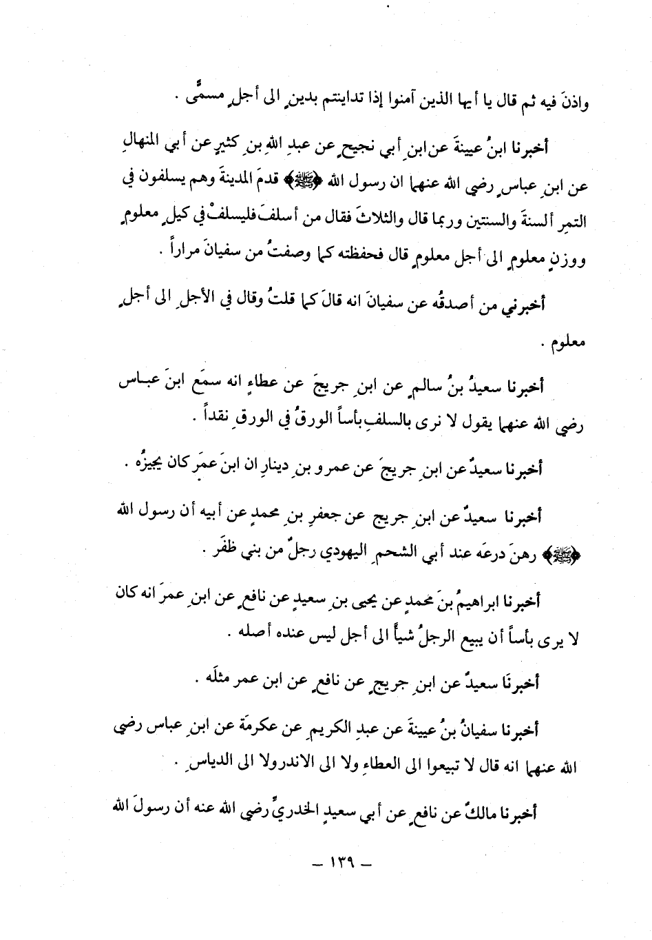 أَخْبَرَنَا ابْنُ عُيَيْنَةَ، عَنِ ابْنِ أَبِي نَجِيحٍ، عَنْ عَبْدِ اللَّهِ بْنِ كَثِيرٍ، عَنْ أَبِي الْمِنْهَالِ، عَنِ ابْنِ عَبَّاسٍ رَضِيَ اللَّهُ عَنْهُمَا أَنَّ رَسُولَ اللَّهِ صَلَّى اللهُ عَلَيْهِ وَسَلَّمَ قَدِمَ الْمَدِينَةَ وَهُمْ يُسْلِفُونَ فِي التَّمْرِ السَّنَةَ وَالسَّنَتَيْنِ، وَرُبَّمَا قَالَ: وَالثَّلَاثَ، فَقَالَ: «§مَنْ أَسْلَفَ فَلْيُسْلِفْ فِي كَيْلٍ مَعْلُومٍ وَوَزْنٍ مَعْلُومٍ إِلَى أَجْلٍ مَعْلُومٍ» قَالَ: فَحَفِظْتُهُ كَمَا وَصَفْتُ مِنْ سُفْيَانَ مِرَارًا أَخْبَرَنِي مَنْ، أُصَدِّقُهُ عَنْ سُفْيَانَ، أَنَّهُ قَالَ كَمَا قُلْتُ، وَقَالَ فِي الْأَجَلِ: إِلَى أَجْلٍ مَعْلُومٍ