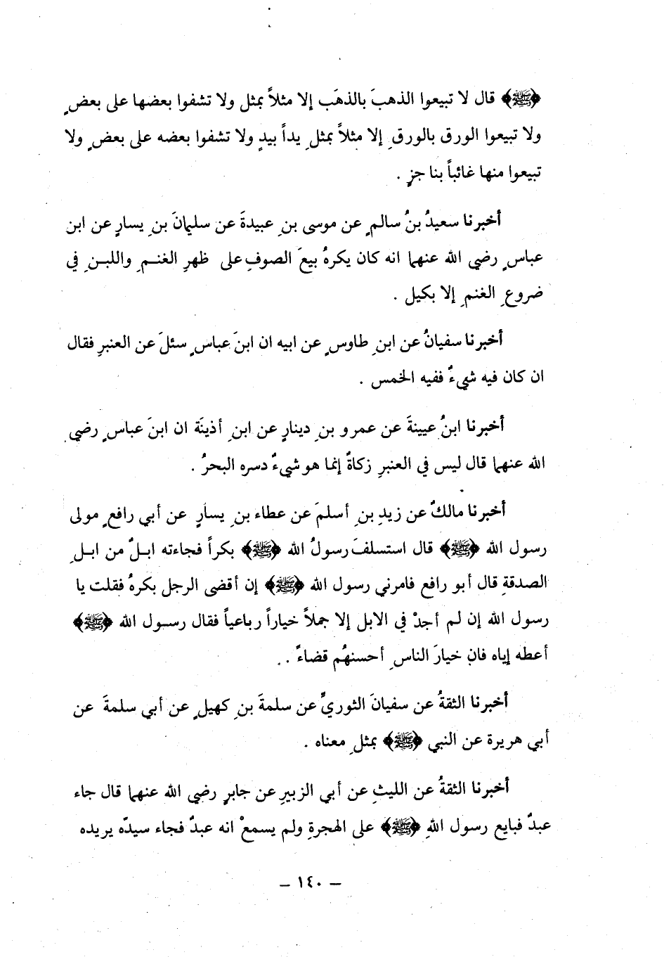 أَخْبَرَنَا سَعِيدُ بْنُ سَالِمٍ، عَنْ مُوسَى بْنِ عُبَيْدَةَ، عَنْ سُلَيْمَانَ بْنِ يَسَارٍ، عَنِ ابْنِ عَبَّاسٍ رَضِيَ اللَّهُ عَنْهُمَا أَنَّهُ كَانَ §يَكْرَهُ بَيْعَ الصُّوفِ عَلَى ظَهْرِ الْغَنَمِ، وَاللَّبَنِ فِي ضُرُوعِ الْغَنَمِ إِلَّا بِكَيْلٍ