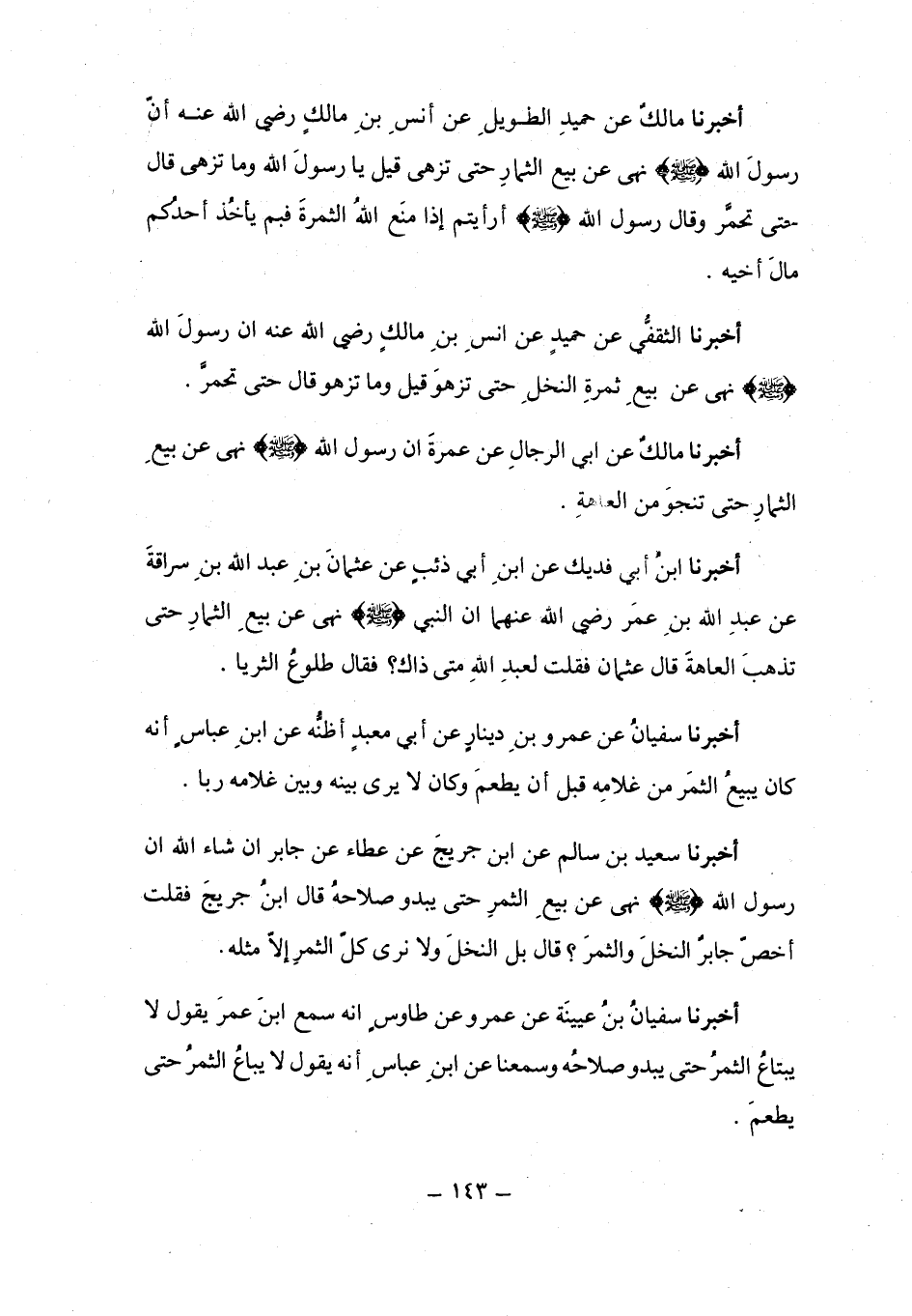 أَخْبَرَنَا مَالِكٌ، عَنْ حُمَيْدٍ الطَّوِيلِ، عَنْ أَنَسِ بْنِ مَالِكٍ رَضِيَ اللَّهُ عَنْهُ، أَنَّ رَسُولَ اللَّهِ صَلَّى اللهُ عَلَيْهِ وَسَلَّمَ §نَهَى عَنْ بَيْعِ الثِّمَارِ حَتَّى تُزْهَى. قِيلَ: يَا رَسُولَ اللَّهِ، وَمَا تُزْهَى؟ قَالَ: «حَتَّى تَحْمَرَّ». وَقَالَ رَسُولُ اللَّهِ صَلَّى اللهُ عَلَيْهِ وَسَلَّمَ: «أَرَأَيْتُمْ إِذَا مَنَعَ اللَّهُ الثَّمَرَةَ، فَبِمَ يَأْخُذُ أَحَدُكُمْ مَالَ أَخِيهِ»
