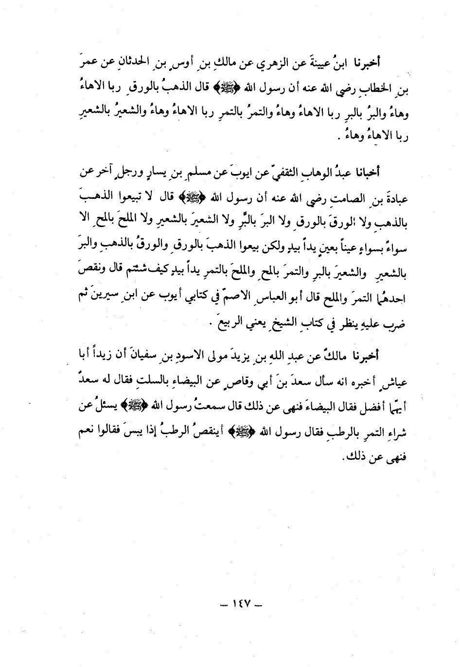 أَخْبَرَنَا ابْنُ عُيَيْنَةَ، عَنِ الزُّهْرِيِّ، عَنْ مَالِكِ بْنِ أَوْسِ بْنِ الْحَدَثَانِ، عَنْ عُمَرَ بْنِ الْخَطَّابِ رَضِيَ اللَّهُ عَنْهُ، أَنَّ رَسُولَ اللَّهِ صَلَّى اللهُ عَلَيْهِ وَسَلَّمَ قَالَ: «§الذَّهَبُ بِالْوَرِقِ رِبًا إِلَّا هَاءَ وَهَاءَ، وَالْبُرُّ بِالْبُرِّ رِبًا إِلَّا هَاءَ وَهَاءَ، وَالتَّمْرُ بِالتَّمْرِ رِبًا إِلَّا هَاءَ وَهَاءَ، وَالشَّعِيرُ بِالشَّعِيرِ رِبًا إِلَّا هَاءَ وَهَاءَ»