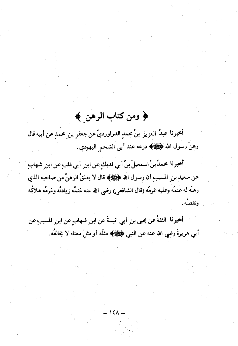 أَخْبَرَنَا مُحَمَّدُ بْنُ إِسْمَاعِيلَ بْنِ أَبِي فُدَيْكٍ، عَنِ ابْنِ أَبِي ذِئْبٍ، عَنِ ابْنِ شِهَابٍ، عَنْ سَعِيدِ بْنِ الْمُسَيِّبِ، أَنَّ رَسُولَ اللَّهِ صَلَّى اللهُ عَلَيْهِ وَسَلَّمَ قَالَ: «§لَا يَغْلَقُ الرَّهْنُ مِنْ صَاحِبِهِ الَّذِي رَهَنَهُ، لَهُ غُنْمُهُ وَعَلَيْهِ غُرْمُهُ» قَالَ الشَّافِعِيُّ رَضِيَ اللَّهُ عَنْهُ: غُنْمُهُ: زِيَادَتُهُ، وَغُرْمُهُ: هَلَاكُهُ وَنَقْصُهُ أَخْبَرَنَا الثِّقَةُ، عَنْ يَحْيَى بْنِ أَبِي أُنَيْسَةَ، عَنِ ابْنِ شِهَابٍ، عَنِ ابْنِ الْمُسَيِّبِ، عَنْ أَبِي هُرَيْرَةَ رَضِيَ اللَّهُ عَنْهُ عَنِ النَّبِيِّ صَلَّى اللهُ عَلَيْهِ وَسَلَّمَ مِثْلَهُ، أَوْ مِثْلَ مَعْنَاهُ، لَا يُخَالِفُهُ