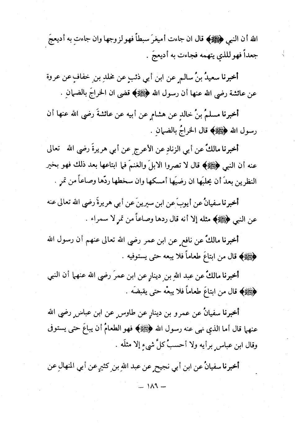 أَخْبَرَنَا سُفْيَانُ بْنُ عُيَيْنَةَ، عَنِ الزُّهْرِيِّ، عَنْ أَبِي الزِّنَادِ، عَنِ الْأَعْرَجِ، عَنْ أَبِي هُرَيْرَةَ، رَضِيَ اللَّهُ تَعَالَى عَنْهُ أَنَّ رَسُولَ اللَّهِ صَلَّى اللهُ عَلَيْهِ وَسَلَّمَ قَالَ: «§لَا يُصَلِّيَنَّ أَحَدُكُمْ فِي الثَّوْبِ الْوَاحِدِ لَيْسَ عَلَى عَاتِقَيْهِ مِنْهُ شَيْءٌ»