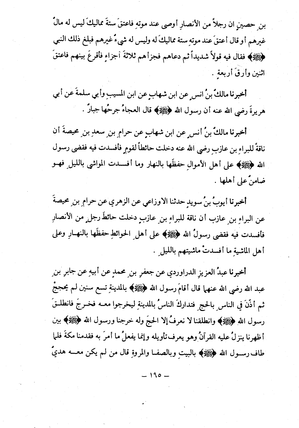 أَخْبَرَنَا مَالِكٌ، عَنْ أَبِي الزِّنَادِ، عَنِ الْأَعْرَجِ، عَنْ أَبِي هُرَيْرَةَ، رَضِيَ اللَّهُ تَعَالَى عَنْهُ أَنَّ النَّبِيَّ صَلَّى اللهُ عَلَيْهِ وَسَلَّمَ قَالَ: «§لَا تُصَرُّوا الْإِبِلَ وَالْغَنَمَ، فَمَنِ ابْتَاعَهَا بَعْدَ ذَلِكَ فَهُوَ بِخَيْرِ النَّظَرَيْنِ بَعْدَ أَنْ يَحْلُبَهَا، إِنْ رَضِيَهَا أَمْسَكَهَا، وَإِنْ سَخِطَهَا رَدَّهَا وَصَاعًا مِنْ تَمْرٍ» أَخْبَرَنَا سُفْيَانُ، عَنْ أَيُّوبَ، عَنِ ابْنِ سِيرِينَ، عَنْ أَبِي هُرَيْرَةَ، رَضِيَ اللَّهُ تَعَالَى عَنْهُ عَنِ النَّبِيِّ صَلَّى اللهُ عَلَيْهِ وَسَلَّمَ مِثْلَهُ إِلَّا أَنَّهُ قَالَ: «رَدَّهَا وَصَاعًا مِنْ تَمْرٍ، لَا سَمْرَاءَ»