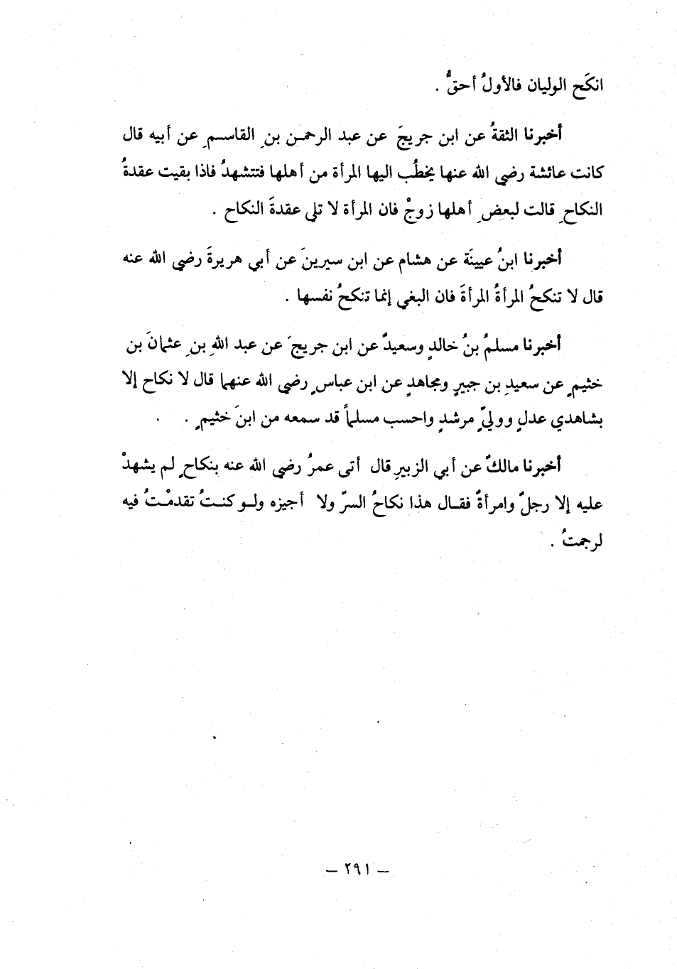 أَخْبَرَنَا سَعِيدُ بْنُ سَالِمٍ، عَنِ ابْنِ جُرَيْجٍ، عَنْ سُلَيْمَانَ بْنِ مُوسَى، عَنِ ابْنِ شِهَابٍ، عَنْ عُرْوَةَ، عَنْ عَائِشَةَ رَضِيَ اللَّهُ عَنْهَا، عَنِ النَّبِيِّ صَلَّى اللهُ عَلَيْهِ وَسَلَّمَ أَنَّهُ قَالَ: «§أَيُّمَا امْرَأَةٍ نُكِحَتْ بِغَيْرِ إِذْنٍ وَلِيِّهَا فَنِكَاحُهَا بَاطِلٌ، ثَلَاثًا، فَإِنْ أَصَابَهَا فَلَهَا الْمَهْرُ بِمَا اسْتَحَلَّ مِنْ فَرْجِهَا، فَإِنِ اشْتَجَرُوا فَالسُّلْطَانُ وَلِيُّ مَنْ لَا وَلِيَّ لَهُ»