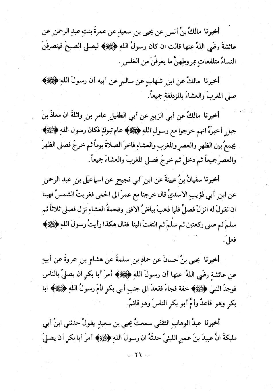 أَخْبَرَنَا مَالِكُ بْنُ أَنَسٍ، عَنْ يَحْيَى بْنِ سَعِيدٍ، عَنْ عَمْرَةَ بِنْتِ عَبْدِ الرَّحْمَنِ، عَنْ عَائِشَةَ رَضِيَ اللَّهُ عَنْهَا قَالَتْ: §إِنْ كَانَ رَسُولُ اللَّهِ صَلَّى اللهُ عَلَيْهِ وَسَلَّمَ لَيُصَلِّي الصُّبْحَ فَيَنْصَرِفْنَ النِّسَاءُ مُتَلَفِّعَاتٍ بِمُرُوطِهِنَّ، مَا يُعْرَفْنَ مِنَ الْغَلَسِ