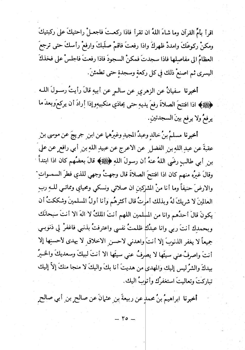 أَخْبَرَنَا مُسْلِمُ بْنُ خَالِدٍ، وَعَبْدُ الْمَجِيدِ، وَغَيْرُهُمَا، عَنِ ابْنِ جُرَيْجٍ، عَنْ مُوسَى بْنِ عُقْبَةَ، عَنْ عَبْدِ اللَّهِ بْنِ الْفَضْلِ، عَنِ الْأَعْرَجِ، عَنْ عُبَيْدِ اللَّهِ بْنِ أَبِي رَافِعٍ، عَنْ عَلِيِّ بْنِ أَبِي طَالِبٍ رَضِيَ اللَّهُ عَنْهُ، أَنَّ رَسُولَ اللَّهِ صَلَّى اللهُ عَلَيْهِ وَسَلَّمَ، قَالَ بَعْضُهُمْ: كَانَ إِذَا ابْتَدَأَ، وَقَالَ غَيْرُهُ مِنْهُمْ: كَانَ إِذَا افْتَتَحَ الصَّلَاةَ قَالَ: «§وَجَّهْتُ وَجْهِيَ لِلَّذِي فَطَرَ السَّمَوَاتِ وَالْأَرْضَ حَنِيفًا وَمَا أَنَا مِنَ الْمُشْرِكِينَ، إِنَّ صَلَاتِي وَنُسُكِي وَمَحْيَايَ وَمَمَاتِي لِلَّهِ رَبِّ الْعَالَمِينَ، لَا شَرِيكَ لَهُ، وَبِذَلِكَ أُمِرْتُ». قَالَ أَكْثَرَهُمْ: «وَأَنَا أَوَّلُ الْمُسْلِمِينَ». وَشَكَكْتُ أَنْ يَكُونَ قَالَ أَحَدُهُمْ: «وَأَنَا مِنَ الْمُسْلِمِينَ. اللَّهُمَّ أَنْتَ الْمَلِكُ لَا إِلَهَ إِلَّا أَنْتَ، سُبْحَانَكَ وَبِحَمْدِكَ، أَنْتَ رَبِّي وَأَنَا عَبْدُكَ، ظَلَمْتُ نَفْسِي، وَاعْتَرَفْتُ بِذَنْبِي، فَاغْفِرْ لِي ذُنُوبِي جَمِيعًا، لَا يَغْفِرُ الذُّنُوبَ إِلَّا أَنْتَ، وَاهْدِنِي لِأَحْسَنِ الْأَخْلَاقِ، لَا يَهْدِي لِأَحْسَنِهَا إِلَّا أَنْتَ، وَاصْرِفْ عَنِّي سَيِّئَهَا، لَا يَصْرِفُ عَنِّي سَيِّئَهَا إِلَّا أَنْتَ، لَبَّيْكَ وَسَعْدَيْكَ، وَالْخَيْرُ بِيَدِكَ، وَالشَّرُّ لَيْسَ إِلَيْكَ، وَالْمَهْدِيُّ مَنْ هَدَيْتَ، أَنَا بِكَ وَإِلَيْكَ، لَا مَنْجَا مِنْكَ إِلَّا إِلَيْكَ، تَبَارَكْتَ وَتَعَالَيْتَ، أَسْتَغْفِرُكَ وَأَتُوبُ إِلَيْكَ»