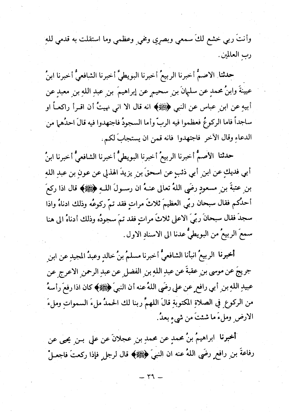 أَخْبَرَنَا ابْنُ أَبِي فُدَيْكٍ، عَنِ ابْنِ أَبِي ذِئْبٍ، عَنْ إِسْحَاقَ بْنِ يَزِيدَ الْهُذَلِيِّ، عَنْ عَوْنِ بْنِ عَبْدِ اللَّهِ بْنِ عُتْبَةَ بْنِ مَسْعُودٍ رَضِيَ اللَّهُ عَنْهُ، أَنَّ رَسُولَ اللَّهِ صَلَّى اللهُ عَلَيْهِ وَسَلَّمَ قَالَ: " §إِذَا رَكَعَ أَحَدُكُمْ فَقَالَ: سُبْحَانَ رَبِّيَ الْعَظِيمِ ثَلَاثَ مَرَّاتٍ، فَقَدْ تَمَّ رُكُوعُهُ، وَذَلِكَ أَدْنَاهُ، وَإِذَا سَجَدَ فَقَالَ: سُبْحَانَ رَبِّيَ الْأَعْلَى ثَلَاثَ مَرَّاتٍ، فَقَدْ تَمَّ سُجُودُهُ، وَذَلِكَ أَدْنَاهُ " إِلَى هُنَا سَمِعَ الرَّبِيعُ مِنَ البُوَيْطِيِّ. عُدْنَا إِلَى الْإِسْنَادِ الْأَوَّلِ