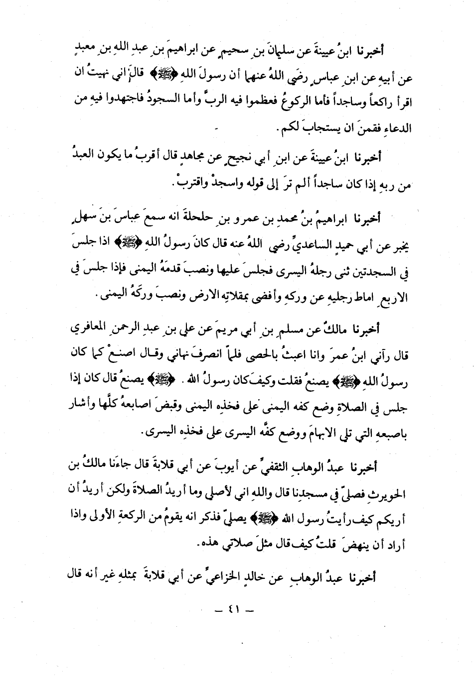 أَخْبَرَنَا ابْنُ عُيَيْنَةَ، عَنْ سُلَيْمَانَ بْنِ سُحَيْمٍ، عَنْ إِبْرَاهِيمَ بْنِ عَبْدِ اللَّهِ بْنِ مَعْبَدٍ، عَنْ أَبِيهِ، عَنِ ابْنِ عَبَّاسٍ رَضِيَ اللَّهُ عَنْهُمَا، أَنَّ رَسُولَ اللَّهِ صَلَّى اللهُ عَلَيْهِ وَسَلَّمَ قَالَ: «إِنِّي §نُهِيتُ أَنْ أَقْرَأَ رَاكِعًا وَسَاجِدًا، فَأَمَّا الرُّكُوعُ فَعَظِّمُوا فِيهِ الرَّبَّ، وَأَمَّا السُّجُودُ فَاجْتَهِدُوا فِيهِ مِنَ الدُّعَاءِ؛ فَقَمِنٌ أَنْ يُسْتَجَابَ لَكُمْ»
