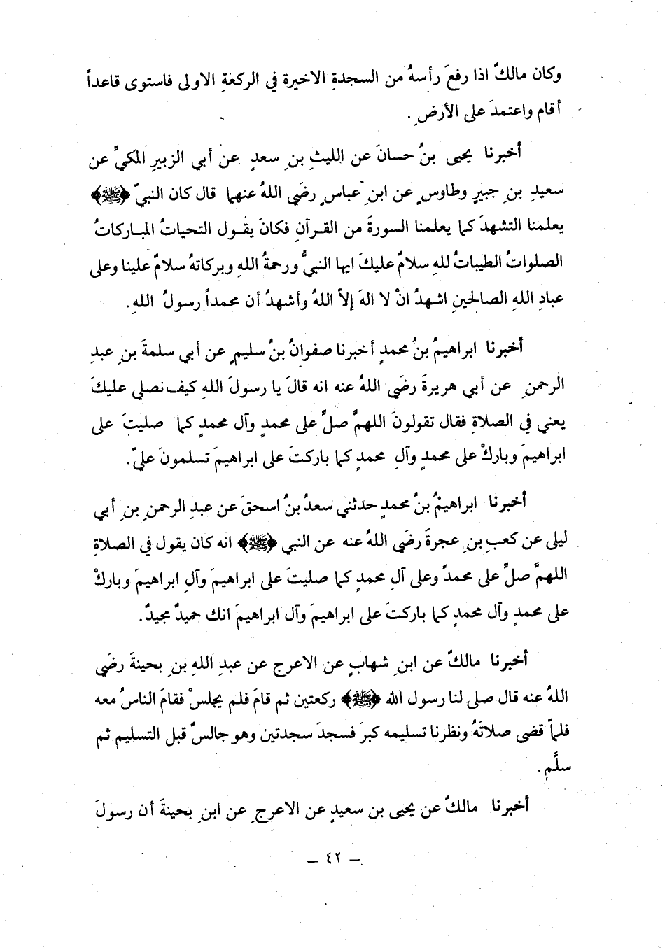 أَخْبَرَنَا مَالِكٌ، عَنْ يَحْيَى بْنِ سَعِيدٍ، عَنِ الْأَعْرَجِ، عَنِ ابْنِ بُحَيْنَةَ، أَنَّ رَسُولَ -[43]- اللَّهِ صَلَّى اللهُ عَلَيْهِ وَسَلَّمَ §قَامَ فِي الثِّنْتَيْنِ مِنَ الظُّهْرِ فَلَمْ يَجْلِسْ فِيهِمَا، فَلَمَّا قَضَى صَلَاتَهُ سَجَدَ سَجْدَتَيْنِ ثُمَّ سَلَّمَ بَعْدَ ذَلِكَ