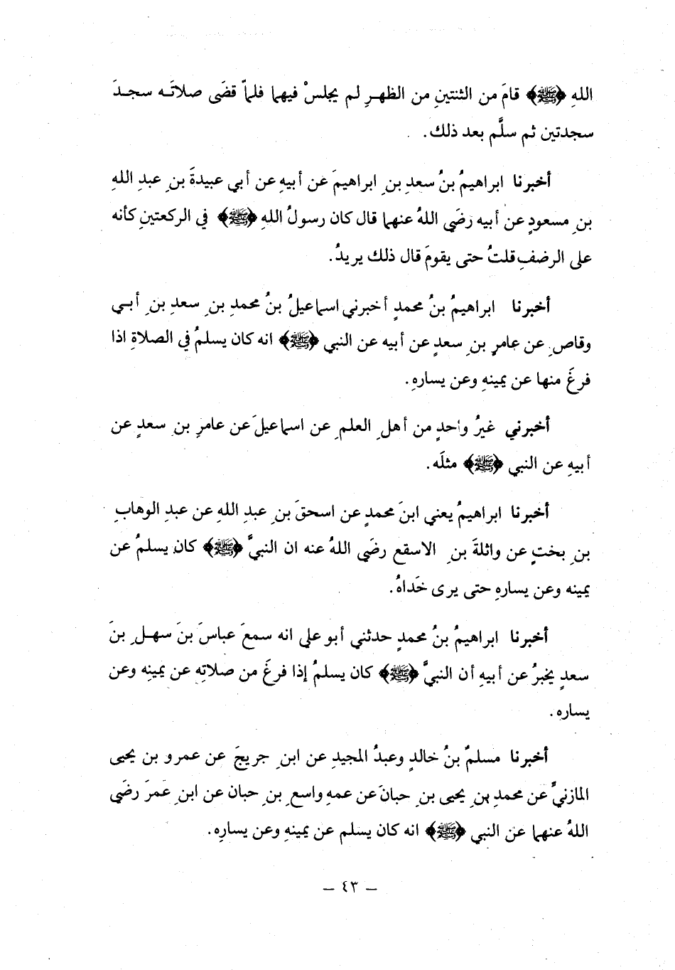 أَخْبَرَنَا إِبْرَاهِيمُ بْنُ مُحَمَّدٍ، أَخْبَرَنِي إِسْمَاعِيلُ بْنُ مُحَمَّدِ بْنِ سَعْدِ بْنِ أَبِي وَقَّاصٍ، عَنْ عَامِرِ بْنِ سَعْدٍ، عَنْ أَبِيهِ، عَنِ النَّبِيِّ صَلَّى اللهُ عَلَيْهِ وَسَلَّمَ أَنَّهُ كَانَ §يُسَلِّمُ فِي الصَّلَاةِ إِذَا فَرَغَ مِنْهَا عَنْ يَمِينِهِ وَعَنْ يَسَارِهِ. أَخْبَرَنِي غَيْرُ وَاحِدٍ، مِنْ أَهْلِ الْعِلْمِ عَنْ إِسْمَاعِيلَ، عَنْ عَامِرِ بْنِ سَعْدٍ، عَنْ أَبِيهِ، عَنِ النَّبِيِّ صَلَّى اللهُ عَلَيْهِ وَسَلَّمَ مِثْلَهُ