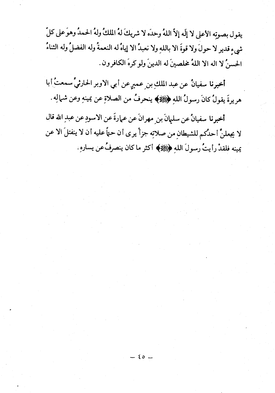 أَخْبَرَنَا سُفْيَانُ، عَنْ سُلَيْمَانَ بْنِ مِهْرَانَ، عَنْ عُمَارَةَ، عَنِ الْأَسْوَدِ، عَنْ عَبْدِ اللَّهِ قَالَ: §لَا يَجْعَلَنَّ أَحَدُكُمْ لِلشَّيْطَانِ مِنْ صَلَاتِهِ جُزْءًا، يَرَى أَنَّ حَتْمًا عَلَيْهِ أَنْ لَا يَنْفَتِلَ إِلَّا عَنْ يَمِينِهِ، فَلَقَدْ رَأَيْتُ رَسُولَ اللَّهِ صَلَّى اللهُ عَلَيْهِ وَسَلَّمَ أَكْثَرَ مَا كَانَ يَنْصَرِفُ عَنْ يَسَارِهِ