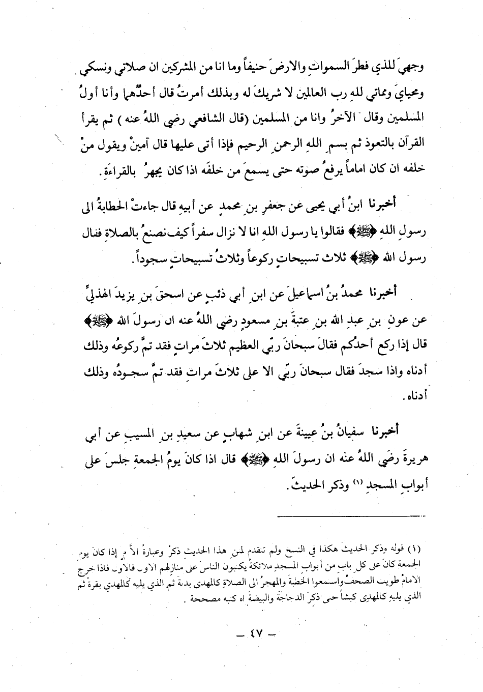 أَخْبَرَنَا سُفْيَانُ بْنُ عُيَيْنَةَ، عَنِ ابْنِ شِهَابٍ، عَنْ سَعِيدِ بْنِ الْمُسَيِّبِ، عَنْ أَبِي هُرَيْرَةَ رَضِيَ اللَّهُ عَنْهُ، أَنَّ رَسُولَ اللَّهِ صَلَّى اللهُ عَلَيْهِ وَسَلَّمَ قَالَ: «§إِذَا كَانَ يَوْمُ الْجُمُعَةِ جَلَسَ عَلَى أَبْوَابِ الْمَسْجِدِ. . .». وَذَكَرَ الْحَدِيثَ