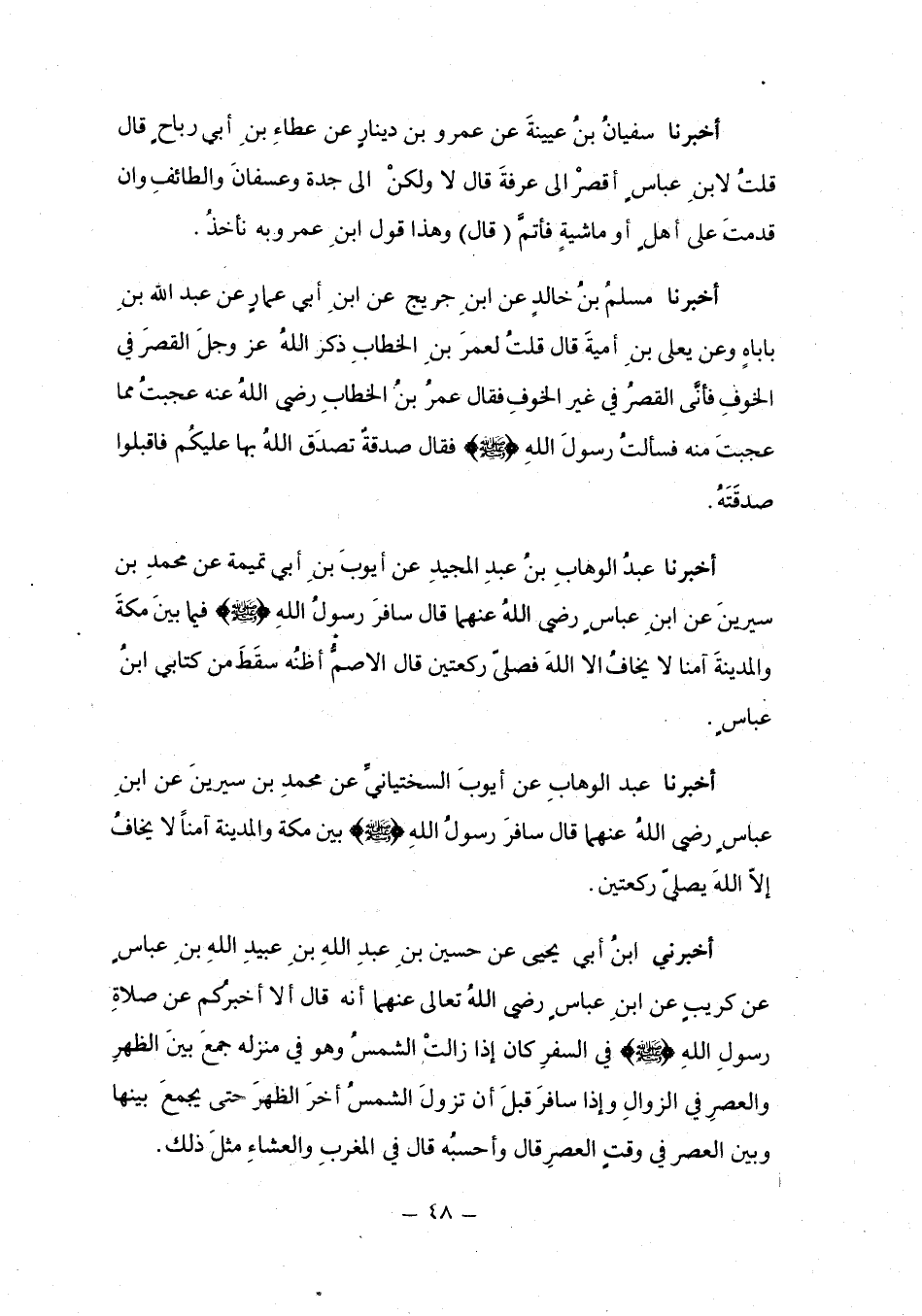 أَخْبَرَنَا عَبْدُ الْوَهَّابِ، عَنْ أَيُّوبَ السَّخْتِيَانِيِّ، عَنْ مُحَمَّدِ بْنِ سِيرِينَ، عَنِ ابْنِ عَبَّاسٍ رَضِيَ اللَّهُ عَنْهُمَا قَالَ: «§سَافَرَ رَسُولُ اللَّهِ صَلَّى اللهُ عَلَيْهِ وَسَلَّمَ بَيْنَ مَكَّةَ وَالْمَدِينَةِ آمَنَّا لَا يَخَافُ إِلَّا اللَّهَ، يُصَلِّي رَكْعَتَيْنِ»
