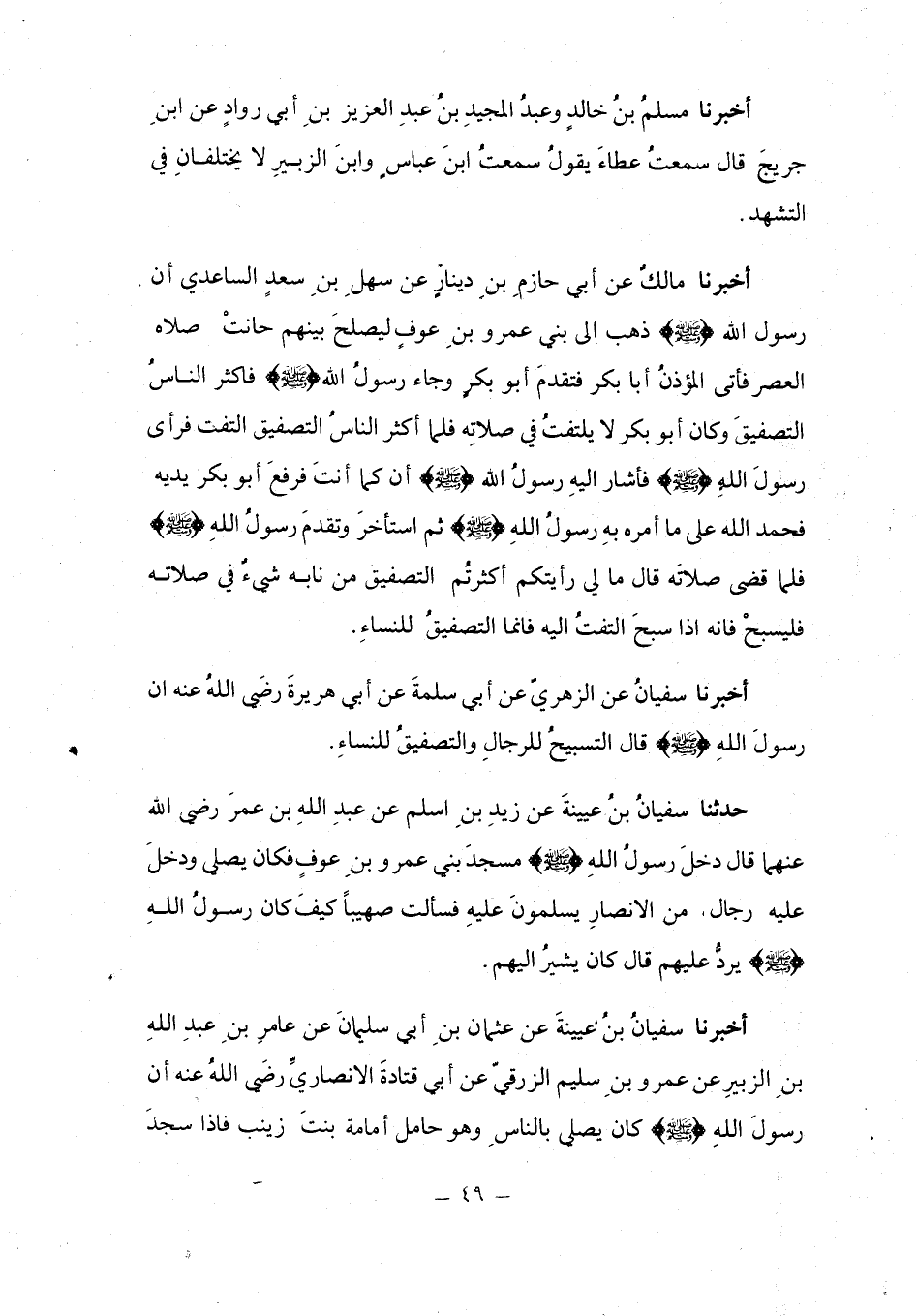 أَخْبَرَنَا سُفْيَانُ، عَنِ الزُّهْرِيِّ، عَنْ أَبِي سَلَمَةَ، عَنْ أَبِي هُرَيْرَةَ رَضِيَ اللَّهُ عَنْهُ، أَنَّ رَسُولَ اللَّهِ صَلَّى اللهُ عَلَيْهِ وَسَلَّمَ قَالَ: «§التَّسْبِيحُ لِلرِّجَالِ، وَالتَّصْفِيقُ لِلنِّسَاءِ»