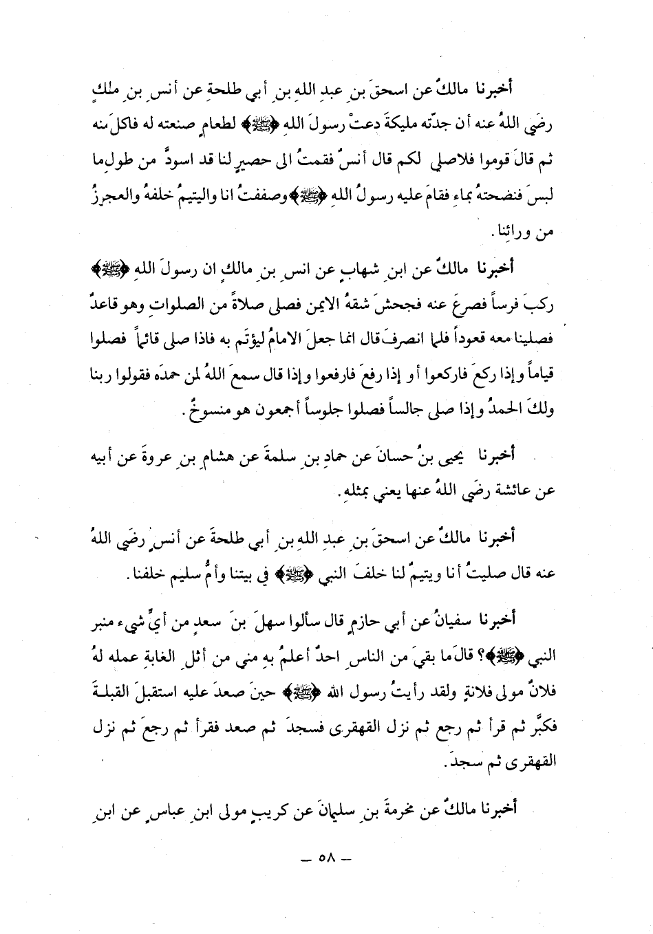 أَخْبَرَنَا مَالِكٌ، عَنْ إِسْحَاقَ بْنِ عَبْدِ اللَّهِ بْنِ أَبِي طَلْحَةَ، عَنْ أَنَسِ بْنِ مَالِكٍ رَضِيَ اللَّهُ عَنْهُ أَنَّ جَدَّتَهُ مُلَيْكَةَ دَعَتْ رَسُولَ اللَّهِ صَلَّى اللهُ عَلَيْهِ وَسَلَّمَ لِطَعَامٍ صَنَعَتْهُ لَهُ فَأَكَلَ مِنْهُ ثُمَّ قَالَ: «§قُومُوا فَلْأُصَلِّي لَكُمْ». قَالَ أَنَسٌ: فَقُمْتُ إِلَى حَصِيرٍ لَنَا قَدِ اسْوَدَّ مِنْ طُولِ مَا لُبِسَ فَنَضَحْتُهُ بِمَاءٍ، فَقَامَ عَلَيْهِ رَسُولُ اللَّهِ صَلَّى اللهُ عَلَيْهِ وَسَلَّمَ، وَصَفَفْتُ أَنَا وَالْيَتِيمُ خَلْفَهُ وَالْعَجُوزُ مِنْ وَرَائِنَا