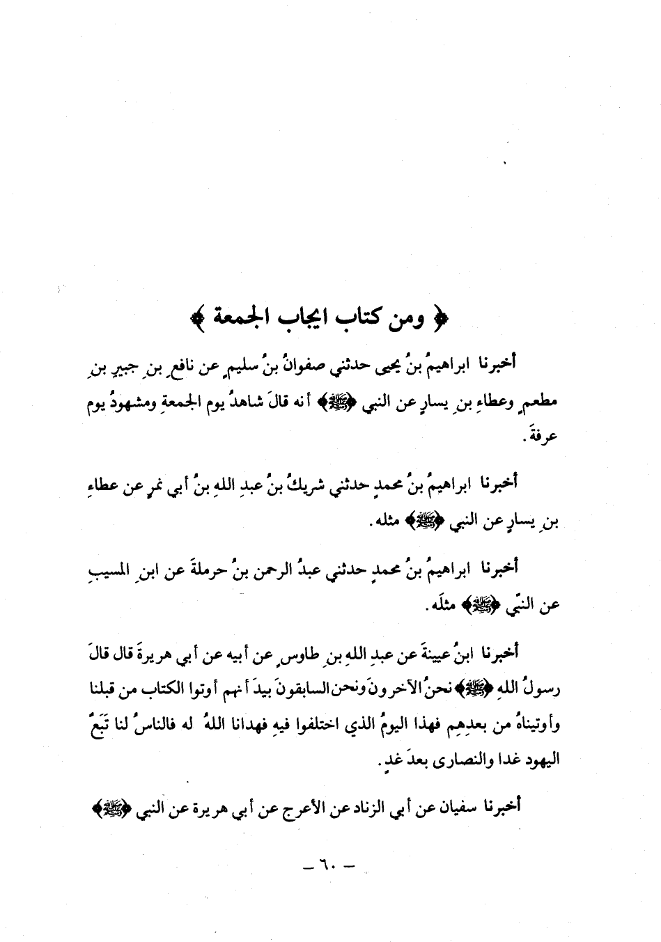 أَخْبَرَنَا ابْنُ عُيَيْنَةَ، عَنْ عَبْدِ اللَّهِ بْنِ طَاوُسٍ، عَنْ أَبِيهِ، عَنْ أَبِي هُرَيْرَةَ قَالَ: قَالَ رَسُولُ اللَّهِ صَلَّى اللهُ عَلَيْهِ وَسَلَّمَ: «§نَحْنُ الْآخِرُونَ، وَنَحْنُ السَّابِقُونَ بَيْدَ أَنَّهُمْ أُوتُوا الْكِتَابَ مِنْ قَبْلِنَا وَأُوتِينَاهُ مِنْ بَعْدِهِمْ، فَهَذَا الْيَوْمُ الَّذِي اخْتَلَفُوا فِيهِ فَهَدَانَا اللَّهُ، فَالنَّاسُ لَنَا تَبَعٌ، الْيَهُودُ غَدًا، وَالنَّصَارَى بَعْدَ غَدٍ» أَخْبَرَنَا سُفْيَانُ، عَنْ أَبِي الزِّنَادِ، عَنِ الْأَعْرَجِ، عَنْ أَبِي هُرَيْرَةَ، عَنِ النَّبِيِّ صَلَّى اللهُ عَلَيْهِ وَسَلَّمَ -[61]- مِثْلَهُ، إِلَّا أَنَّهُ قَالَ: «بَايْدَ أَنَّهُمْ»