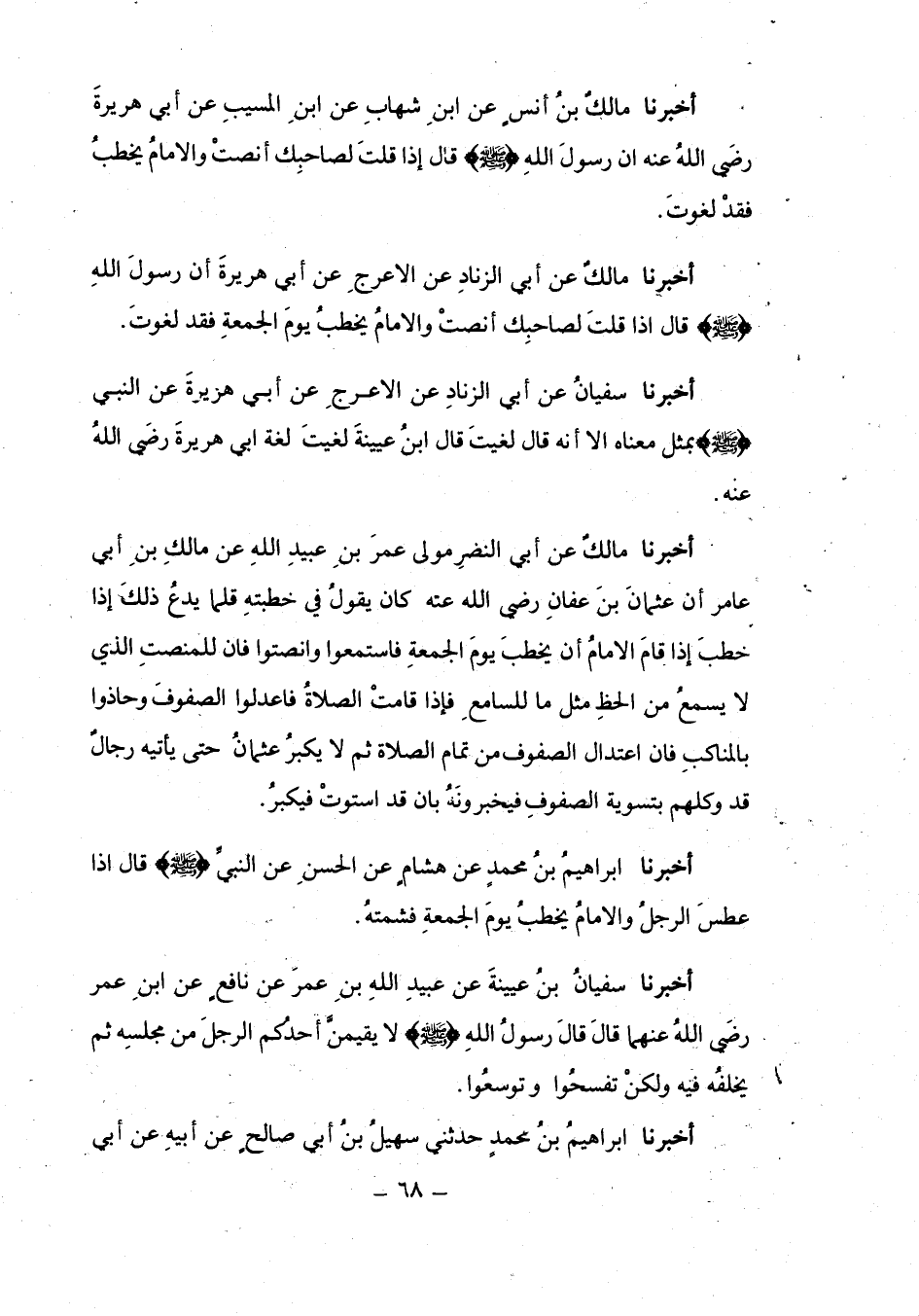 أَخْبَرَنَا مَالِكُ بْنُ أَنَسٍ، عَنِ ابْنِ شِهَابٍ، عَنِ ابْنِ الْمُسَيِّبِ، عَنْ أَبِي هُرَيْرَةَ رَضِيَ اللَّهُ عَنْهُ، أَنَّ رَسُولَ اللَّهِ صَلَّى اللهُ عَلَيْهِ وَسَلَّمَ قَالَ: " §إِذَا قُلْتَ لِصَاحِبِكَ: أَنْصِتْ، وَالْإِمَامُ يَخْطُبُ فَقَدْ لَغَوْتَ "