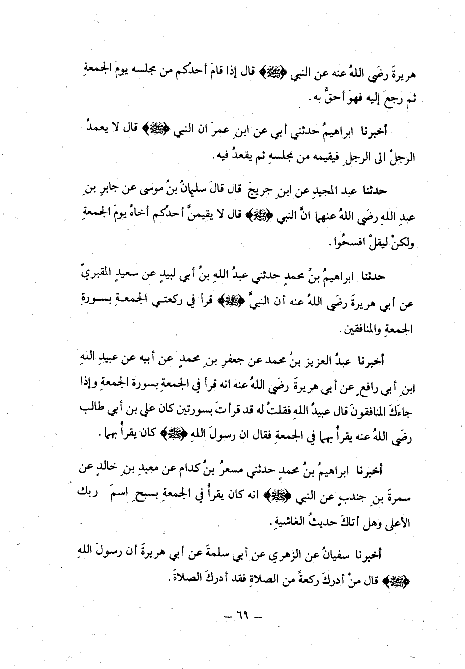 أَخْبَرَنَا عَبْدُ الْعَزِيزِ بْنُ مُحَمَّدٍ، عَنْ جَعْفَرِ بْنِ مُحَمَّدٍ، عَنْ أَبِيهِ، عَنْ عُبَيْدِ اللَّهِ بْنِ أَبِي رَافِعٍ، عَنْ أَبِي هُرَيْرَةَ رَضِيَ اللَّهُ عَنْهُ أَنَّهُ §قَرَأَ فِي الْجُمُعَةِ بِسُورَةِ الْجُمُعَةِ وَإِذَا جَاءَكَ الْمُنَافِقُونَ قَالَ عُبَيْدُ اللَّهِ: فَقُلْتُ لَهُ: قَدْ قَرَأْتُ بِسُورَتَيْنِ كَانَ عَلِيُّ بْنُ أَبِي طَالِبٍ رَضِيَ اللَّهُ عَنْهُ يَقْرَأُ بِهِمَا فِي الْجُمُعَةِ. فَقَالَ: «إِنَّ رَسُولَ اللَّهِ صَلَّى اللهُ عَلَيْهِ وَسَلَّمَ كَانَ يَقْرَأُ بِهِمَا»