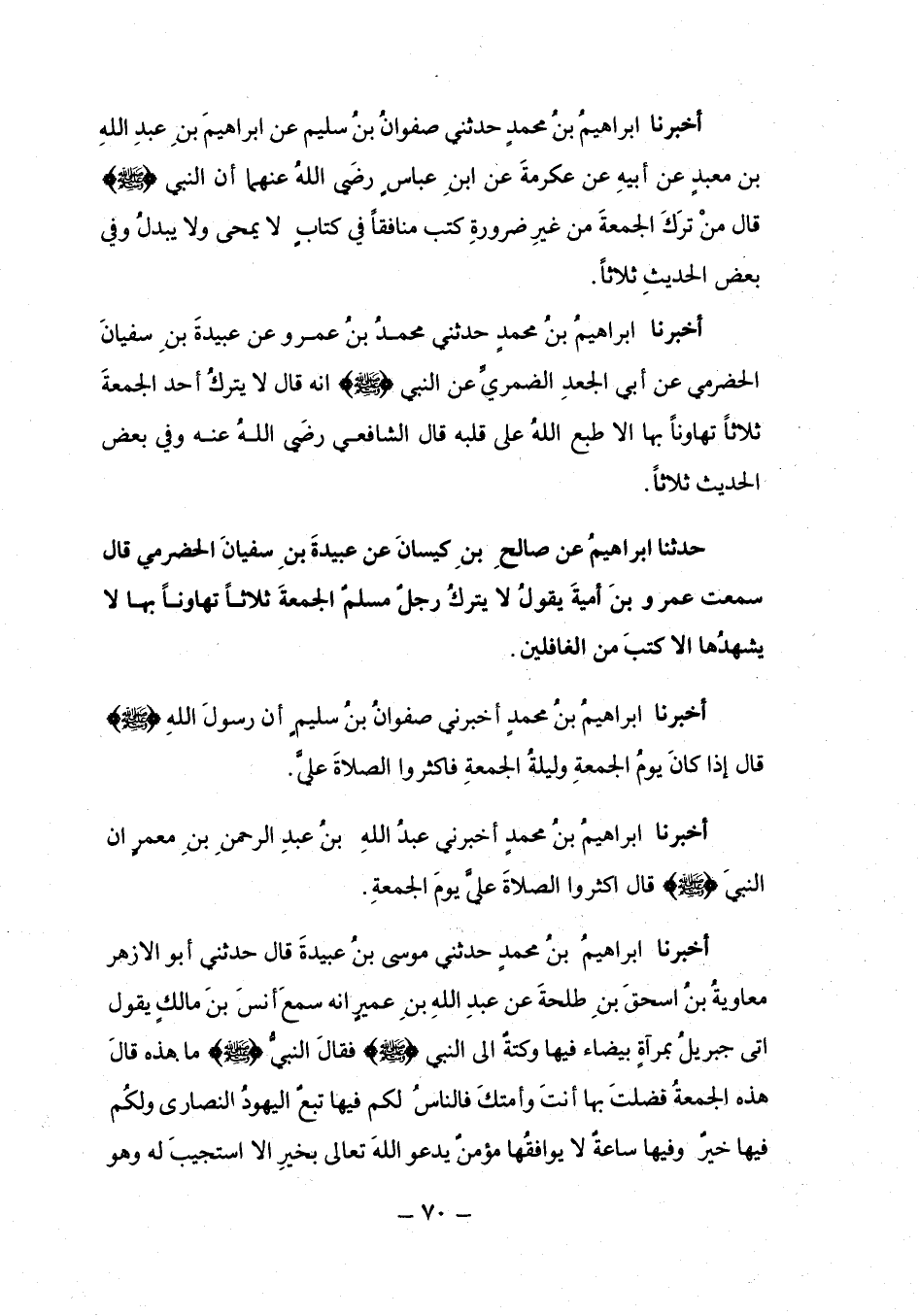 أَخْبَرَنَا إِبْرَاهِيمُ بْنُ مُحَمَّدٍ، حَدَّثَنِي صَفْوَانُ بْنُ سُلَيْمٍ، عَنْ إِبْرَاهِيمَ بْنِ عَبْدِ اللَّهِ بْنِ مَعْبَدٍ، عَنْ أَبِيهِ، عَنْ عِكْرِمَةَ، عَنِ ابْنِ عَبَّاسٍ رَضِيَ اللَّهُ عَنْهُمَا، أَنَّ النَّبِيَّ صَلَّى اللهُ عَلَيْهِ وَسَلَّمَ قَالَ: «§مَنْ تَرَكَ الْجُمُعَةَ مِنْ غَيْرِ ضَرُورَةٍ كُتِبَ مُنَافِقًا فِي كِتَابٍ لَا يُمْحَى وَلَا يُبَدَّلُ» وَفِي بَعْضِ الْحَدِيثِ: «ثَلَاثًا»