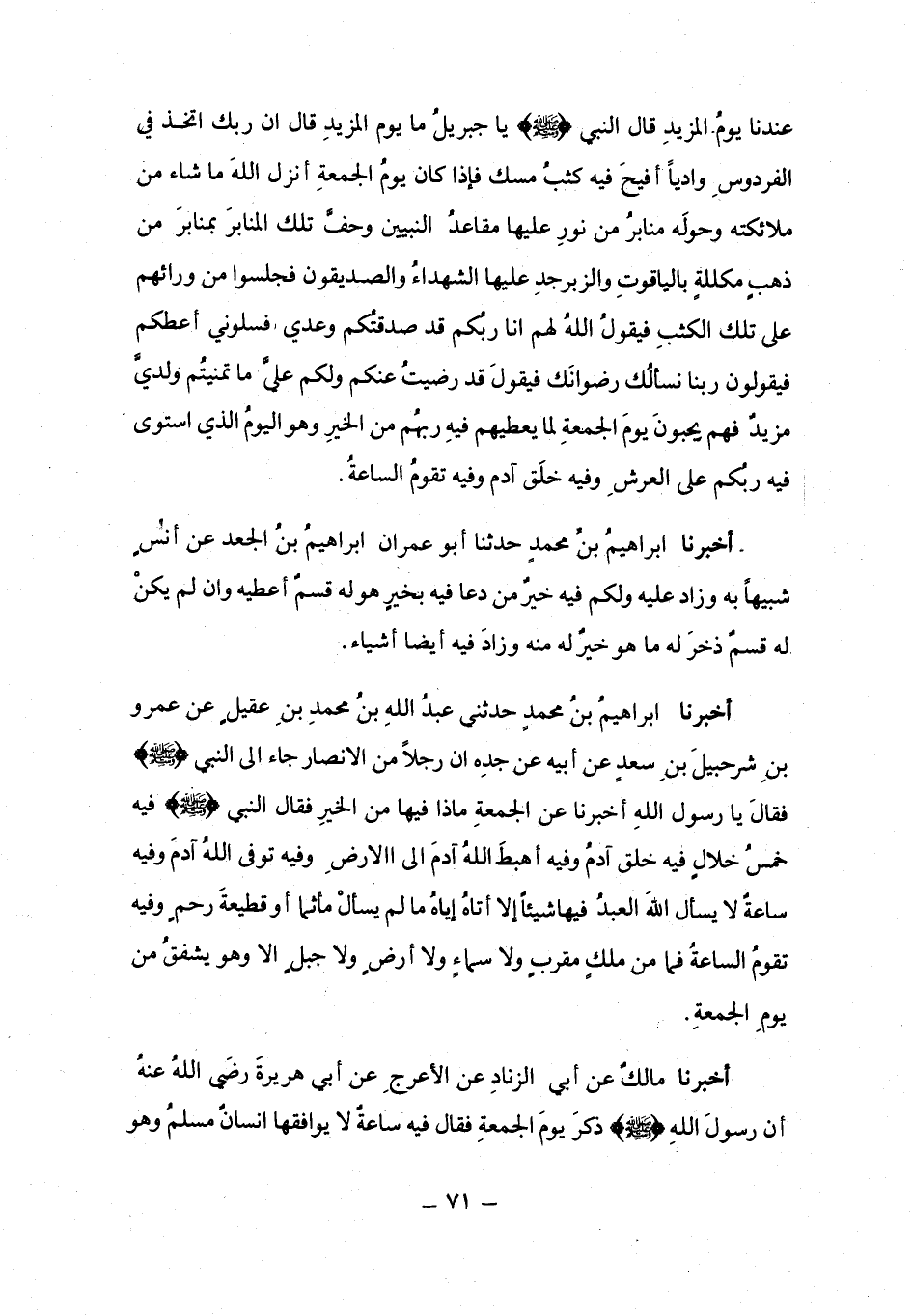 أَخْبَرَنَا مَالِكٌ، عَنْ أَبِي الزِّنَادِ، عَنِ الْأَعْرَجِ، عَنْ أَبِي هُرَيْرَةَ رَضِيَ اللَّهُ عَنْهُ، أَنَّ رَسُولَ اللَّهِ صَلَّى اللهُ عَلَيْهِ وَسَلَّمَ §ذَكَرَ يَوْمَ الْجُمُعَةِ فَقَالَ: «فِيهِ سَاعَةٌ لَا يُوَافِقُهَا إِنْسَانٌ مُسْلِمٌ وَهُوَ -[72]- قَائِمٌ يُصَلِّي، يَسْأَلُ اللَّهَ شَيْئًا إِلَّا أَعْطَاهُ إِيَّاهُ» وَأَشَارَ النَّبِيُّ صَلَّى اللهُ عَلَيْهِ وَسَلَّمَ بِيَدِهِ يُقَلِّلُهَا