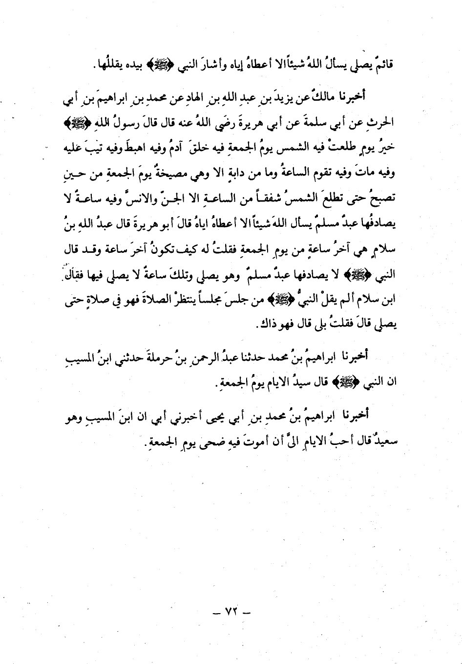 أَخْبَرَنَا مَالِكٌ، عَنْ يَزِيدَ بْنِ عَبْدِ اللَّهِ بْنِ الْهَادِ، عَنْ مُحَمَّدِ بْنِ إِبْرَاهِيمَ بْنِ أَبِي الْحَارِثِ، عَنْ أَبِي سَلَمَةَ، عَنْ أَبِي هُرَيْرَةَ رَضِيَ اللَّهُ عَنْهُ قَالَ: قَالَ رَسُولُ اللَّهِ صَلَّى اللهُ عَلَيْهِ وَسَلَّمَ: «§خَيْرُ يَوْمٍ طَلَعَتْ فِيهِ الشَّمْسُ يَوْمُ الْجُمُعَةِ؛ فِيهِ خُلِقَ آدَمُ، وَفِيهِ أُهْبِطَ، وَفِيهِ تِيبَ عَلَيْهِ، وَفِيهِ مَاتَ، وَفِيهِ تَقُومُ السَّاعَةُ، وَمَا مِنْ دَابَّةٍ إِلَّا وَهِيَ مُصِيخَةٌ يَوْمَ الْجُمُعَةِ مِنْ حِينَ تُصْبِحُ حَتَّى تَطْلُعَ الشَّمْسُ شَفَقًا مِنَ السَّاعَةِ، إِلَّا الْجِنَّ وَالْإِنْسَ، وَفِيهِ سَاعَةٌ لَا يُصَادِفُهَا عَبْدٌ مُسْلِمٌ يَسْأَلُ اللَّهَ شَيْئًا إِلَّا أَعْطَاهُ إِيَّاهُ» قَالَ أَبُو هُرَيْرَةَ: قَالَ عَبْدُ اللَّهِ بْنُ سَلَامٍ: هِيَ آخِرُ سَاعَةٍ مِنْ يَوْمِ الْجُمُعَةِ. فَقُلْتُ لَهُ: كَيْفَ تَكُونُ آخِرَ سَاعَةٍ وَقَدْ قَالَ النَّبِيُّ صَلَّى اللهُ عَلَيْهِ وَسَلَّمَ: " لَا يُصَادِفُهَا عَبْدٌ مُسْلِمٌ وَهُوَ يُصَلِّي، وَتِلْكَ سَاعَةٌ لَا يُصَلَّى فِيهَا؟ فَقَالَ ابْنُ سَلَامٍ: أَلَمْ يَقُلِ النَّبِيُّ صَلَّى اللهُ عَلَيْهِ وَسَلَّمَ: «مَنْ جَلَسَ مَجْلِسًا يَنْتَظِرُ الصَّلَاةَ فَهُوَ فِي صَلَاةٍ حَتَّى يُصَلِّيَ»؟ قَالَ: فَقُلْتُ: بَلَى. قَالَ: فَهُوَ ذَاكَ