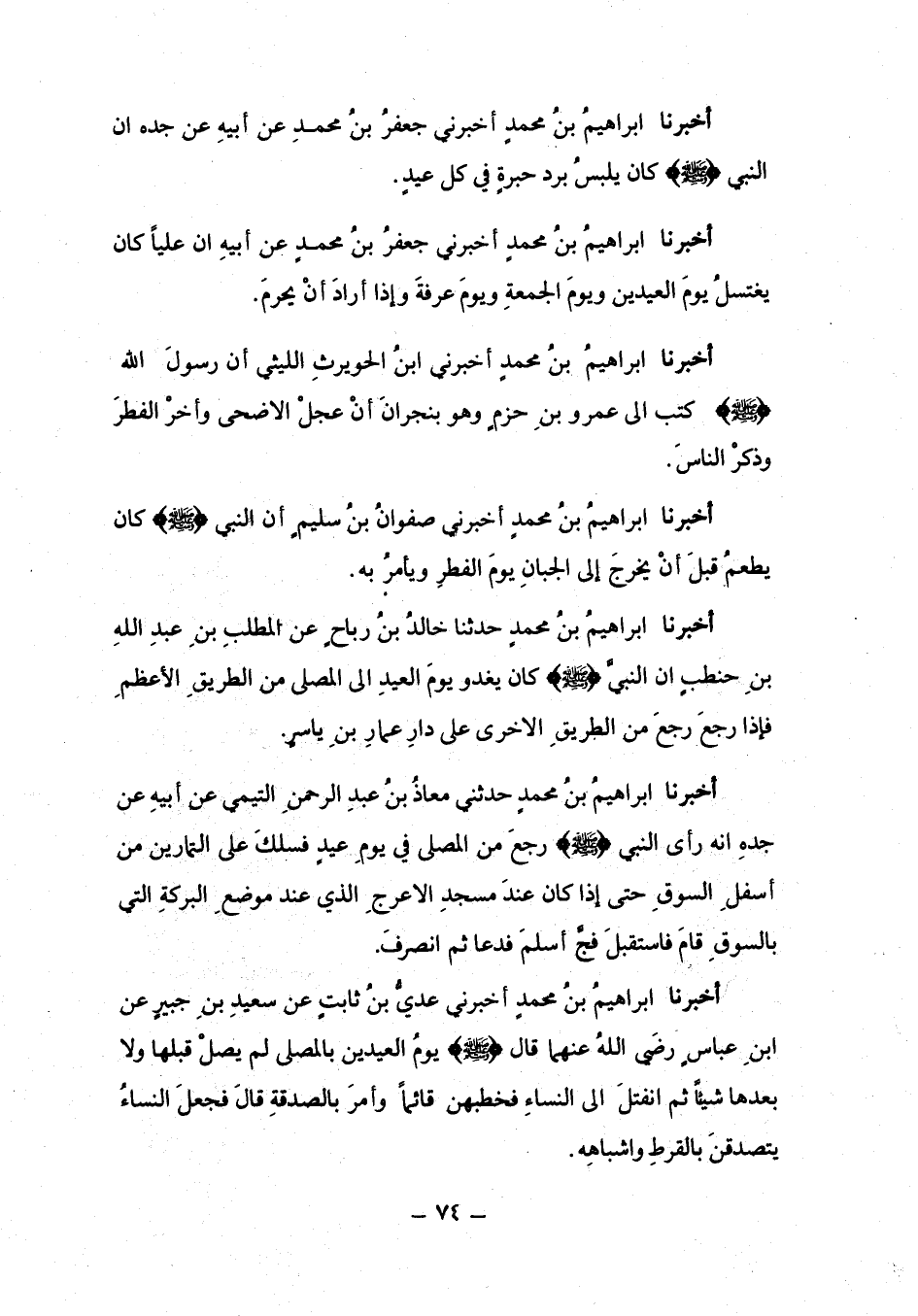 أَخْبَرَنَا إِبْرَاهِيمُ بْنُ مُحَمَّدٍ، أَخْبَرَنِي جَعْفَرُ بْنُ مُحَمَّدٍ، عَنْ أَبِيهِ، عَنْ جَدِّهِ، أَنَّ النَّبِيَّ صَلَّى اللهُ عَلَيْهِ وَسَلَّمَ §كَانَ يَلْبَسُ بُرْدَ حِبَرَةَ فِي كُلِّ عِيدٍ