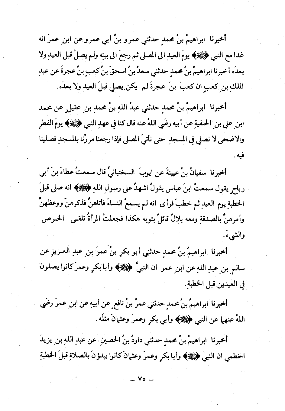 أَخْبَرَنَا إِبْرَاهِيمُ بْنُ مُحَمَّدٍ، حَدَّثَنِي أَبُو بَكْرِ بْنُ عُمَرَ بْنِ عَبْدِ الْرَحْمَنِ، عَنْ سَالِمِ بْنِ عَبْدِ اللَّهِ، عَنْ ابْنِ عُمَرَ، أَنَّ النَّبِيَّ صَلَّى اللهُ عَلَيْهِ وَسَلَّمَ وَأَبَا بَكْرٍ وَعُمَرَ §كَانُوا يُصَلُّونَ فِي الْعِيدَيْنِ قَبْلَ الْخُطْبَةِ أَخْبَرَنَا إِبْرَاهِيمُ بْنُ مُحَمَّدٍ، حَدَّثَنِي عُمَرُ بْنُ نَافِعٍ، عَنْ أَبِيهِ، عَنْ ابْنِ عُمَرَ رَضِيَ اللَّهُ عَنْهُمَا عَنِ النَّبِيِّ صَلَّى اللهُ عَلَيْهِ وَسَلَّمَ وَأَبِي بَكْرٍ وَعُمَرَ وَعُثْمَانَ مِثْلَهُ