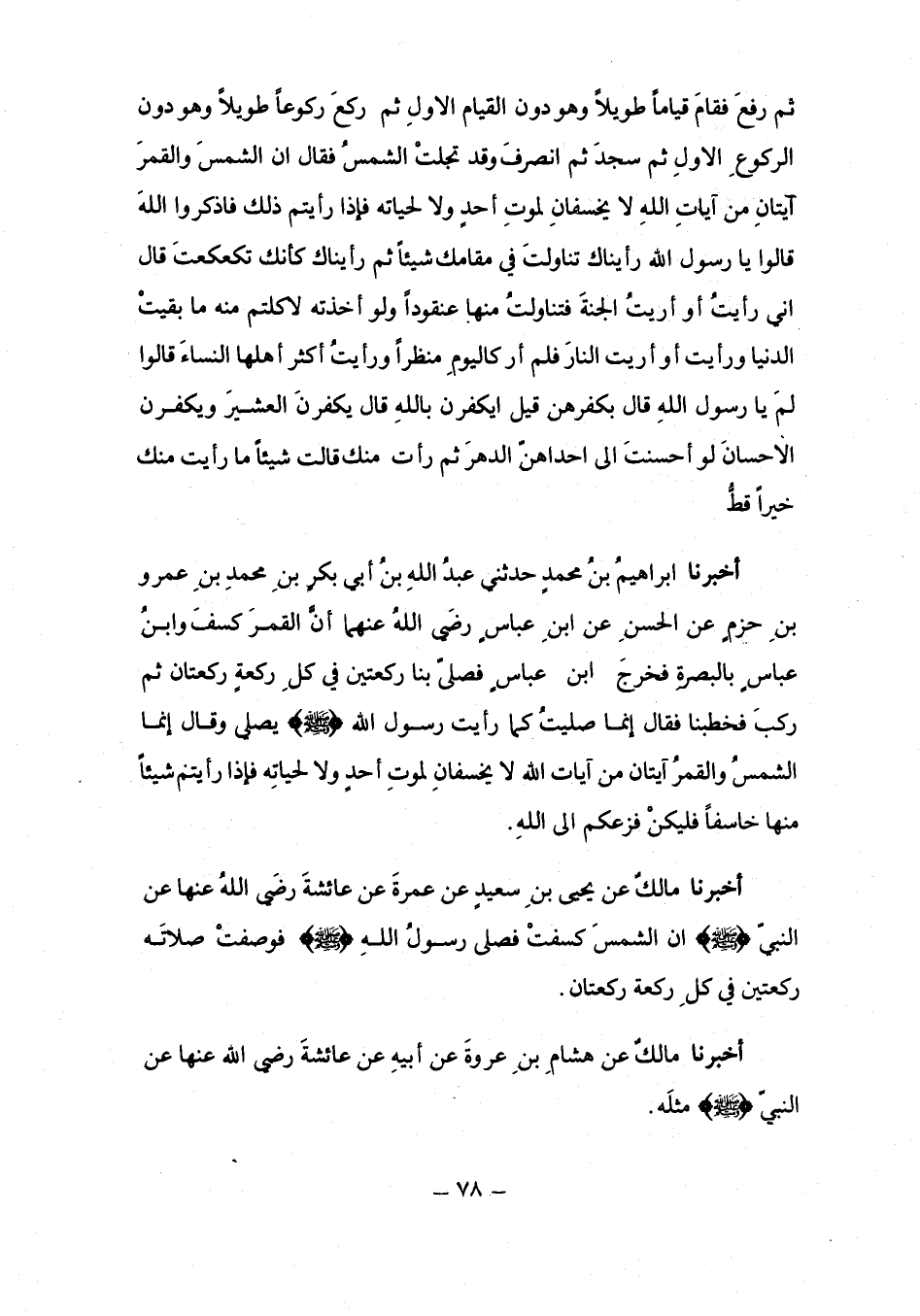 أَخْبَرَنَا مَالِكٌ، عَنْ يَحْيَى بْنِ سَعِيدٍ، عَنْ عَمْرَةَ، عَنْ عَائِشَةَ رَضِيَ اللَّهُ عَنْهَا، عَنِ النَّبِيِّ صَلَّى اللهُ عَلَيْهِ وَسَلَّمَ أَنَّ الشَّمْسَ كَسَفَتْ فَصَلَّى رَسُولُ اللَّهِ صَلَّى اللهُ عَلَيْهِ وَسَلَّمَ، فَوَصَفَتْ صَلَاتَهُ §رَكْعَتَيْنِ، فِي كُلِّ رَكْعَةٍ رَكْعَتَانِ أَخْبَرَنَا مَالِكٌ، عَنْ هِشَامِ بْنِ عُرْوَةَ، عَنْ أَبِيهِ، عَنْ عَائِشَةَ رَضِيَ اللَّهُ عَنْهَا، عَنِ النَّبِيِّ صَلَّى اللهُ عَلَيْهِ وَسَلَّمَ مِثْلَهُ -[79]- أَخْبَرَنَا إِبْرَاهِيمُ بْنُ مُحَمَّدٍ، حَدَّثَنِي أَبُو سُهَيْلِ بْنُ نَافِعٍ، عَنْ أَبِي قِلَابَةَ، عَنْ أَبِي مُوسَى الْأَشْعَرِيِّ رَضِيَ اللَّهُ عَنْهُ عَنِ النَّبِيِّ صَلَّى اللهُ عَلَيْهِ وَسَلَّمَ مِثْلَهُ