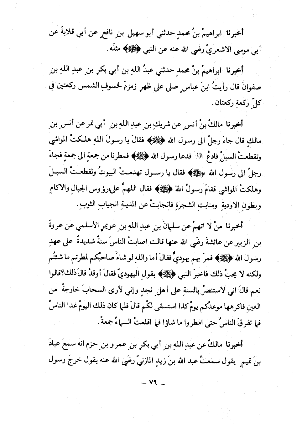 أَخْبَرَنَا مَالِكٌ، عَنْ عَبْدِ اللَّهِ بْنِ أَبِي بَكْرِ بْنِ عَمْرِو بْنِ حَزْمٍ، أَنَّهُ سَمِعَ عَبَّادَ بْنَ تَمِيمٍ، يَقُولُ: سَمِعْتُ عَبْدَ اللَّهِ بْنَ زَيْدٍ الْمَازِنِيَّ رَضِيَ اللَّهُ عَنْهُ يَقُولُ: خَرَجَ رَسُولُ -[80]- اللَّهِ صَلَّى اللهُ عَلَيْهِ وَسَلَّمَ إِلَى الْمُصَلَّى §فَاسْتَسْقَى وَحَوَّلَ رِدَاءَهُ حِينَ اسْتَقْبَلَ الْقِبْلَةَ
