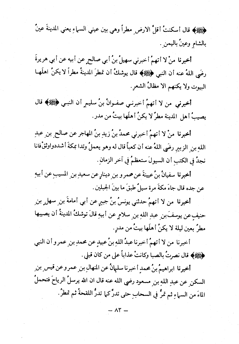 أَخْبَرَنَا مَنْ لَا أَتَّهِمُ، أَخْبَرَنِي سُهَيْلُ بْنُ أَبِي صَالِحٍ، عَنْ أَبِيهِ، عَنْ أَبِي هُرَيْرَةَ رَضِيَ اللَّهُ عَنْهُ، أَنَّ النَّبِيَّ صَلَّى اللهُ عَلَيْهِ وَسَلَّمَ قَالَ: «§يُوشِكُ أَنْ تُمْطَرَ الْمَدِينَةُ مَطَرًا لَا يُكِنُّ أَهْلَهَا الْبُيُوتُ، وَلَا يُكِنَّهُمْ إِلَّا مَظَالُّ الشَّعْرِ»