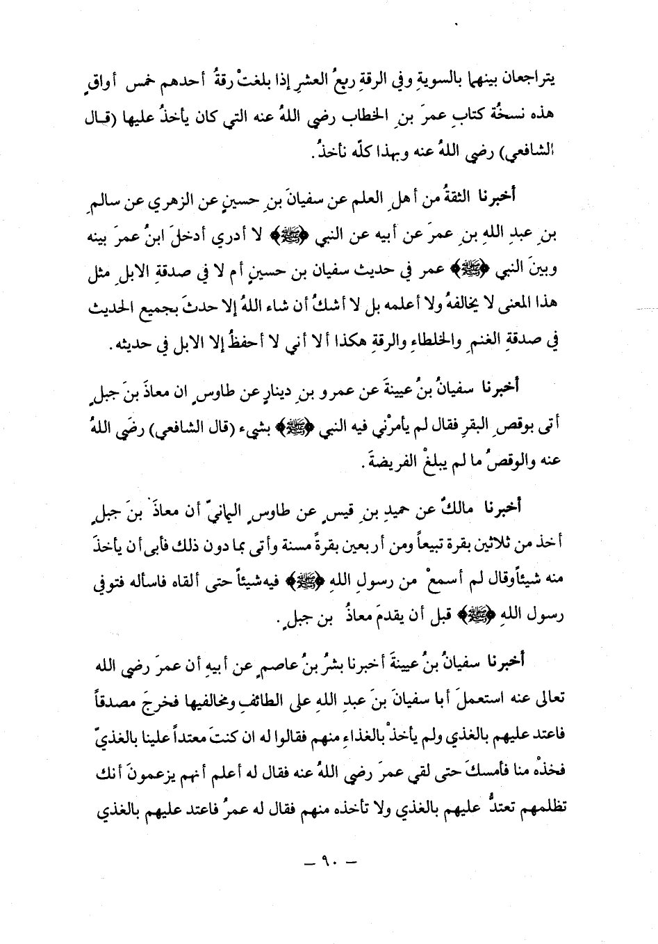 أَخْبَرَنَا سُفْيَانُ بْنُ عُيَيْنَةَ، عَنْ عَمْرِو بْنِ دِينَارٍ، عَنْ طَاوُسٍ، أَنَّ مُعَاذَ بْنَ جَبَلٍ، §أُتِيَ بِوَقَصِ الْبَقَرِ فَقَالَ: «لَمْ يَأْمُرْنِي فِيهِ النَّبِيُّ صَلَّى اللهُ عَلَيْهِ وَسَلَّمَ بِشَيْءٍ» قَالَ الشَّافِعِيُّ رَضِيَ اللَّهُ عَنْهُ: وَالْوَقْصُ مَا لَمْ يَبْلُغِ الْفَرِيضَةَ