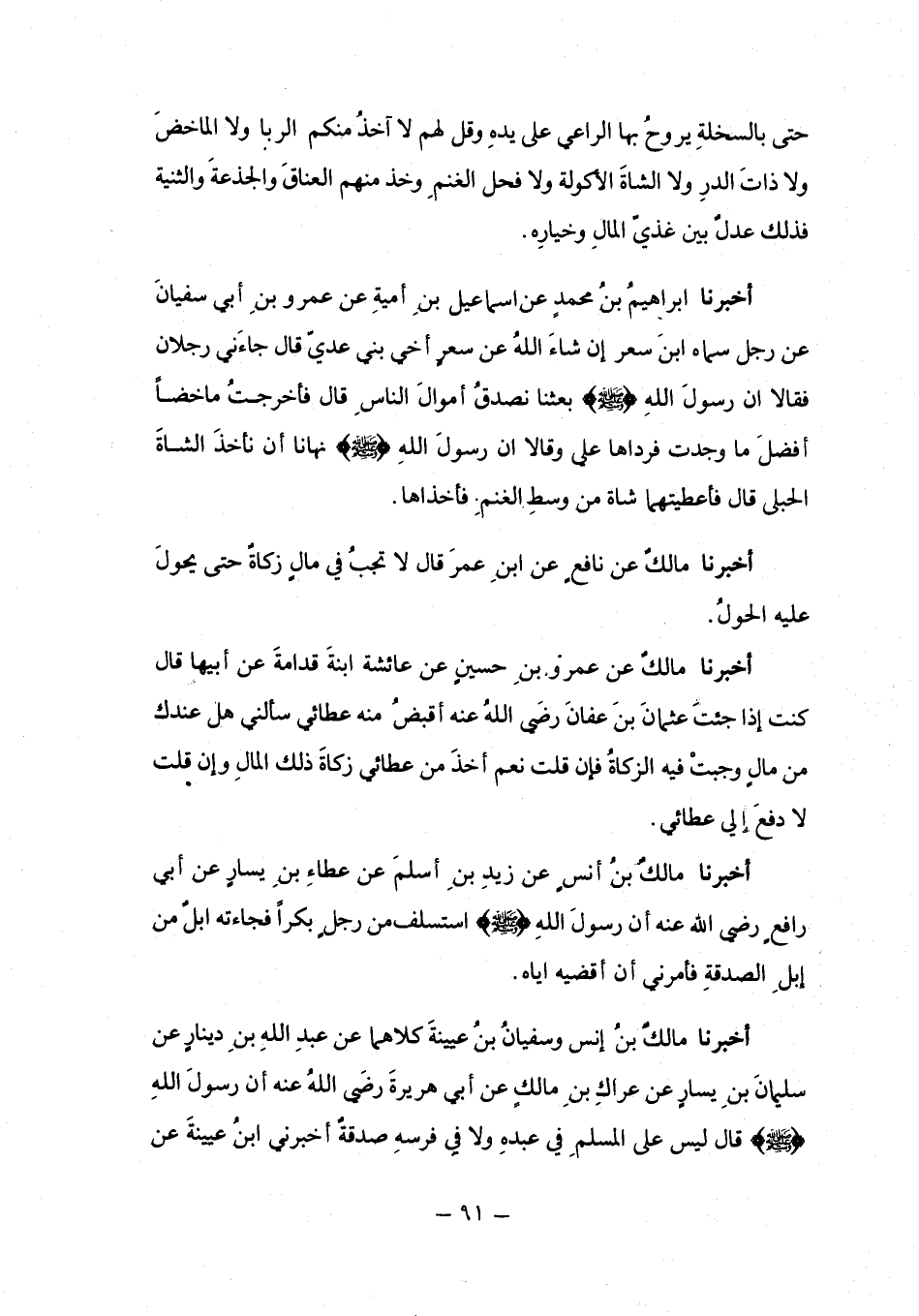 أَخْبَرَنَا مَالِكٌ، عَنْ نَافِعٍ، عَنِ ابْنِ عُمَرَ قَالَ: «§لَا تَجِبُ فِي مَالٍ زَكَاةٌ حَتَّى يَحُولَ عَلَيْهِ الْحَوْلُ»