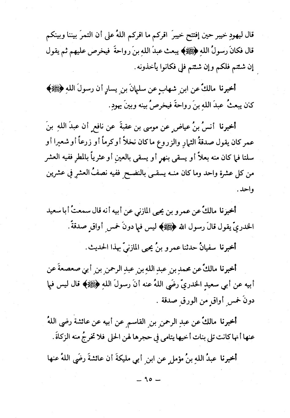 أَخْبَرَنَا مَالِكٌ، عَنْ مُحَمَّدِ بْنِ عَبْدِ اللَّهِ بْنِ عَبْدِ الرَّحْمَنِ بْنِ أَبِي صَعْصَعَةَ، عَنْ أَبِيهِ، عَنْ أَبِي سَعِيدٍ الْخُدْرِيِّ رَضِيَ اللَّهُ عَنْهُ، أَنَّ رَسُولَ اللَّهِ صَلَّى اللهُ عَلَيْهِ وَسَلَّمَ قَالَ: «§لَيْسَ فِيمَا دُونَ خَمْسِ أَوَاقٍ مِنَ الْوَرِقِ صَدَقَةٌ»
