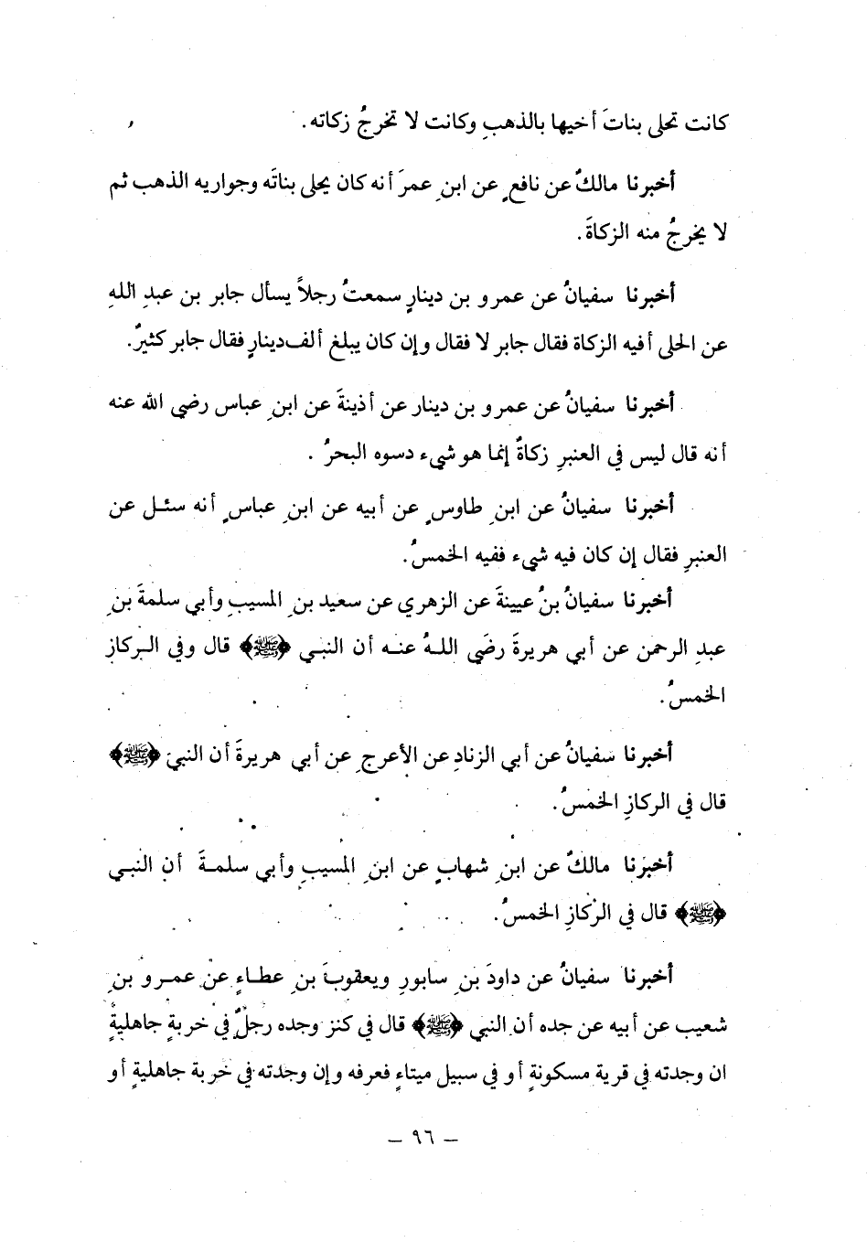 أَخْبَرَنَا سُفْيَانُ، عَنْ عَمْرِو بْنِ دِينَارٍ، عَنْ ابْنِ أُذَيْنَةَ، عَنْ ابْنِ عَبَّاسٍ رَضِيَ اللَّهُ عَنْهُ أَنَّهُ قَالَ: «§لَيْسَ فِي الْعَنْبَرِ زَكَاةٌ، إِنَّمَا هُوَ شَيْءٌ دَسَرَهُ الْبَحْرُ»
