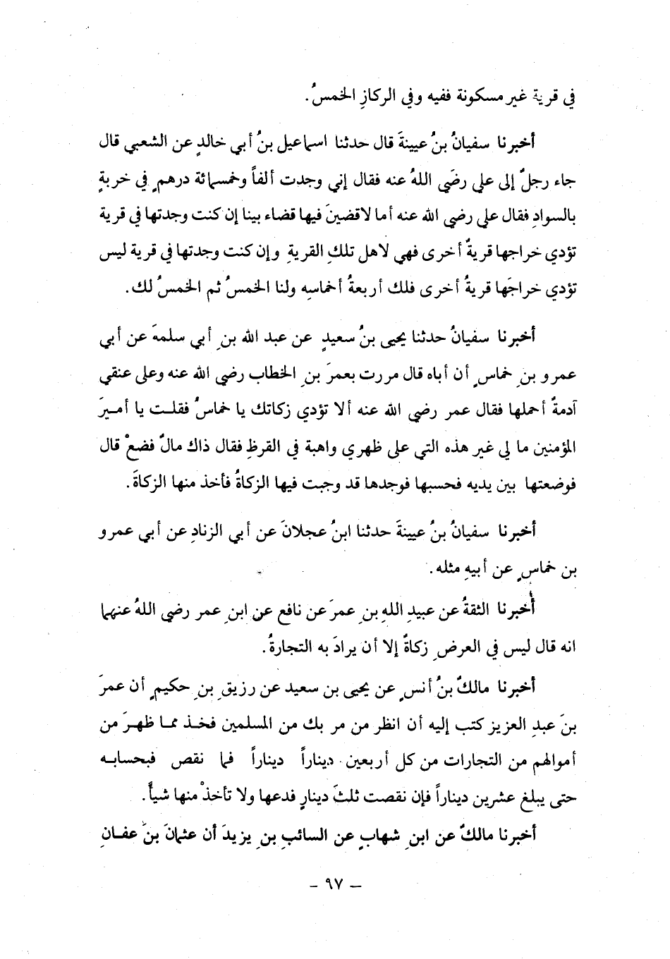 أَخْبَرَنَا مَالِكُ بْنُ أَنَسٍ، عَنْ يَحْيَى بْنِ سَعِيدٍ، عَنْ رُزَيْقِ بْنِ حَكِيمٍ، أَنَّ عُمَرَ بْنَ عَبْدِ الْعَزِيزِ، كَتَبَ إِلَيْهِ: أَنِ «انْظُرْ، مَنْ مَرَّ بِكَ مِنَ الْمُسْلِمِينَ فَخُذْ مِمَّا ظَهَرَ مِنْ أَمْوَالِهِمْ مِنَ التِّجَارَاتِ مِنْ كُلِّ أَرْبَعِينَ دِينَارًا دِينَارًا، فَمَا نَقَصَ فَبِحَسَابِهِ حَتَّى يَبْلُغَ عِشْرِينَ دِينَارًا، §فَإِنْ نَقَصَتْ ثُلُثَ دِينَارٍ فَدَعْهَا وَلَا تَأْخُذْ مِنْهَا شَيْئًا»
