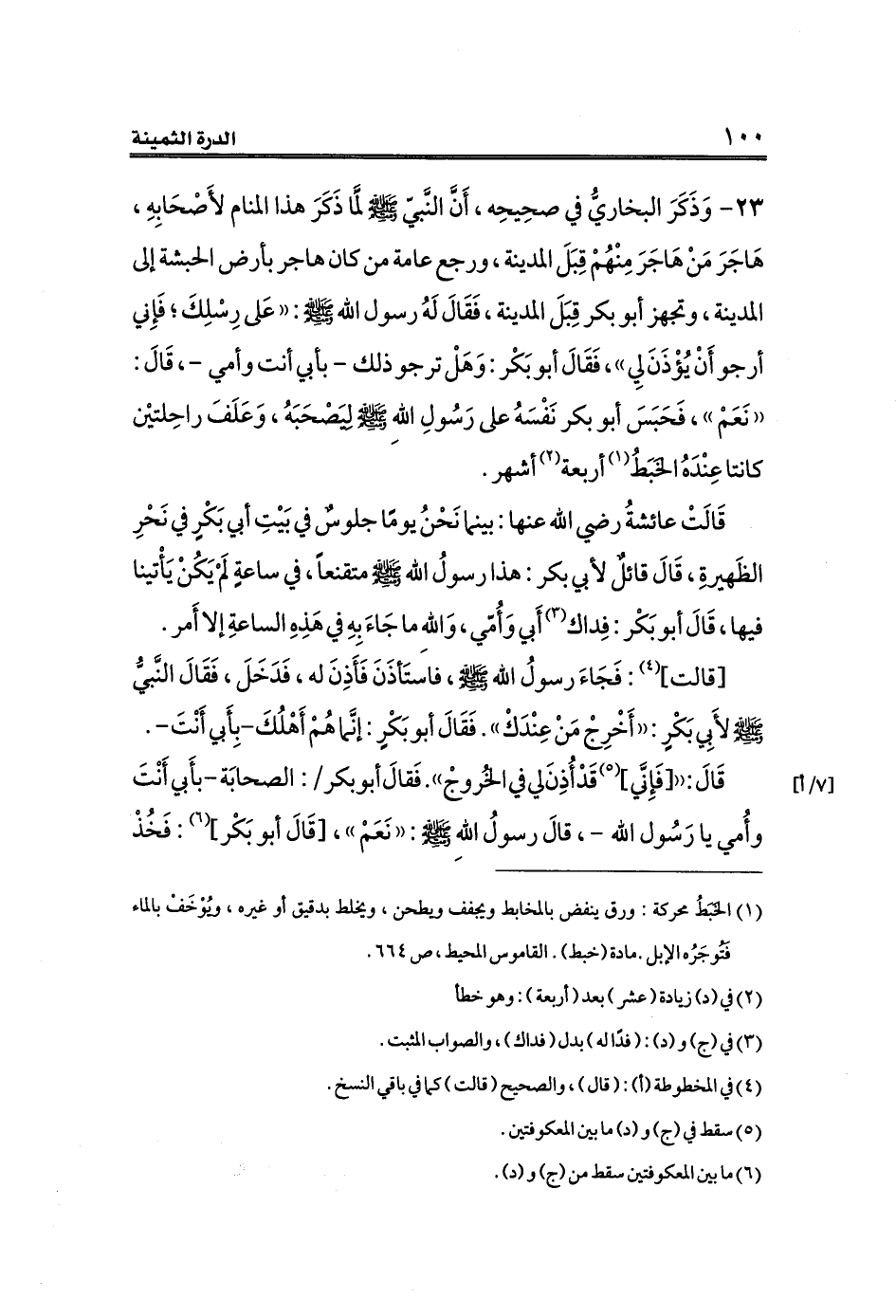 ٢٣ - وَذَكَرَ البخاريُّ في صحِيحِه، أَنَّ النَّبيّ صلى الله عليه وسلم لَمَّا ذَكَرَ هذا المنام لأَصْحَابِهِ، هَاجَرَ مَنْ هَاجَرَ مِنْهُمْ قِبَلَ المدينة، ورجع عامة من كان هاجر بأرض الحبشة إلى المدينة، وتجهز أبو بكر قِبَلَ المدينة، فَقَالَ لَهُ رسول الله صلى الله عليه وسلم: ((عَلى رِسْلِكَ؛ فَإِني أرجو أَنْ يُؤْذَنَ لِي))، فَقَالَ أبو بَكْر: وَهَلْ ترجو ذلك - بأبي أنت وأمي -، قَالَ: