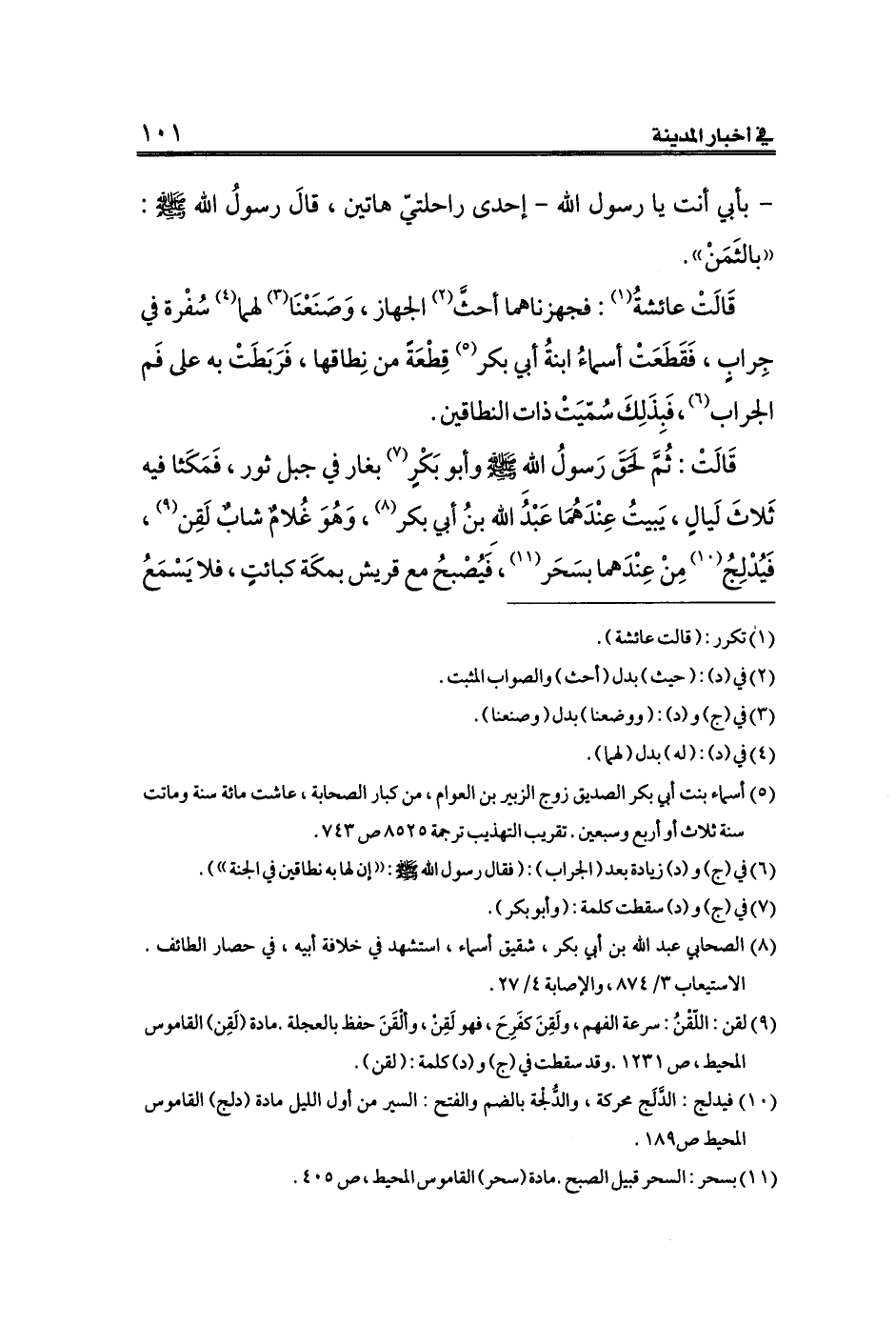 (¬٥) أسماء بنت أبي بكر الصديق زوج الزبير بن العوام، من كبار الصحابة، عاشت مائة سنة وماتت سنة ثلاث أو أربع وسبعين. تقريب التهذيب ترجمة ٨٥٢٥ ص ٧٤٣.