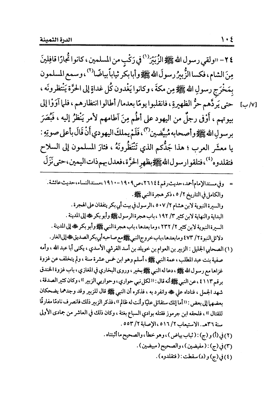 ٢٤ - ((ولقي رسول الله صلى الله عليه وسلم الزُبَيْرَ (¬١) في رَكْبٍ من المسلمين، كانوا تُجارًا قافِلينَ مِنَ الشام، فكسا الزُّبيرُ رسولَ الله صلى الله عليه وسلم وأبا بكر ثياباً بياضًا (¬٢)، وسمع المسلمون بِمَخْرَجِ رسولِ الله - صلى الله عليه وسلم - مِن مكةَ، وكانوا يَغْدون كُل غداةٍ إلى الحرَّة يَنْتظرونَه، حتى يَردَّهم حرُّ الظهيرةِ، فانقلبوا يومًا بعدما [٧/ب] أطالوا انتظارهم، فلما آوَوْا إلى بيوتهم، أَوْفى رجلٌ من اليهود على أطُم مِنَ آطامهم لأمر يَنْظرُ إليه، فَبُصَرَ برسولِ الله - صلى الله عليه وسلم - وأصحابه مُبيَّضين (¬٣)، فَلَمْ يملكَ اليهودي أَنْ قَالَ بأعلى صوتِهِ: