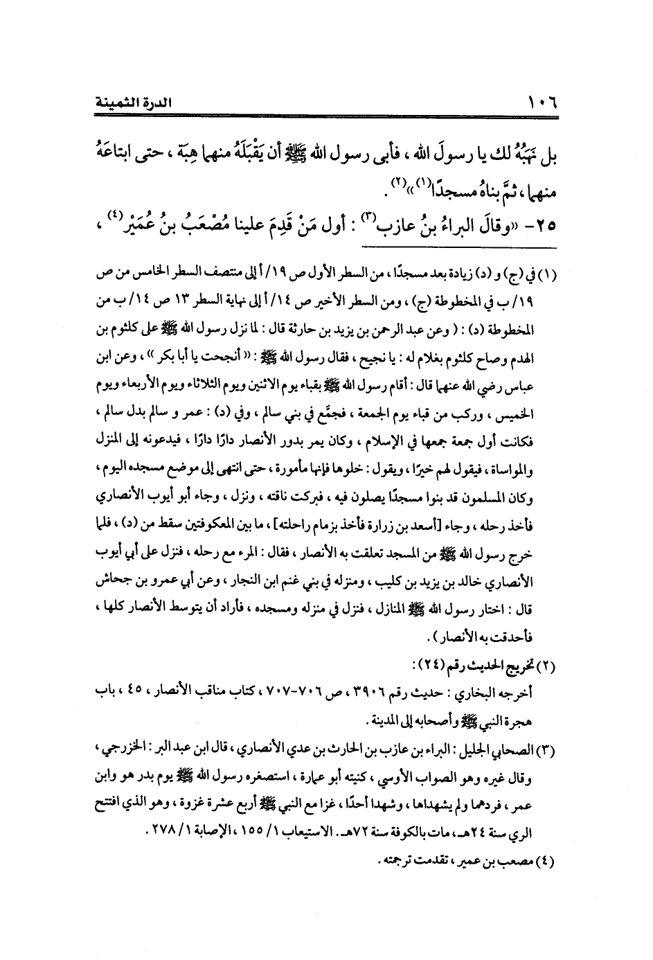 (¬١) في (ج) و (د) زيادة بعد مسجدًا، من السطر الأول ص ١٩/أ إلى منتصف السطر الخامس من ص ١٩/ب في المخطوطة (ج)، ومن السطر الأخير ص ١٤/أ إلى نهاية السطر ١٣ ص ١٤/ب من المخطوطة (د): (وعن عبد الرحمن بن يزيد بن حارثة قال: لما نزل رسول الله صلى الله عليه وسلم على كلثوم بن الهدم وصاح كلثوم بغلام له: يا نجيح، فقال رسول الله صلى الله عليه وسلم: ((أنجحت يا أبا بكر))، وعن ابن عباس رضي الله عنهما قال: أقام رسول الله صلى الله عليه وسلم بقباء يوم الاثنين ويوم الثلاثاء ويوم الأربعاء ويوم الخميس، وركب من قباء يوم الجمعة، فجمَّع في بني سالم، وفي (د): عمر و سالم بدل سالم، فكانت أول جمعة جمعها في الإسلام، وكان يمر بدور الأنصار دارًا دارًا، فيدعونه إلى المنزل والمواساة، فيقول لهم خيرًا، ويقول: خلوها فإنها مأمورة، حتى انتهى إلى موضع مسجده اليوم، وكان المسلمون قد بنوا مسجدًا يصلون فيه، فبركت ناقته، ونزل، وجاء أبو أيوب الأنصاري فأخذ رحله، وجاء [أسعد بن زرارة فأخذ بزمام راحلته]، ما بين المعكوفتين سقط من (د)، فلما خرج رسول الله صلى الله عليه وسلم من المسجد تعلقت به الأنصار، فقال: المرء مع رحله، فنزل على أبي أيوب الأنصاري خالد بن يزيد بن كليب، ومنزله في بني غنم ابن النجار، وعن أبي عمرو بن جحاش قال: اختار رسول الله صلى الله عليه وسلم المنازل، فنزل في منزله ومسجده، فأراد أن يتوسط الأنصار كلها، فأحدقت به الأنصار).
