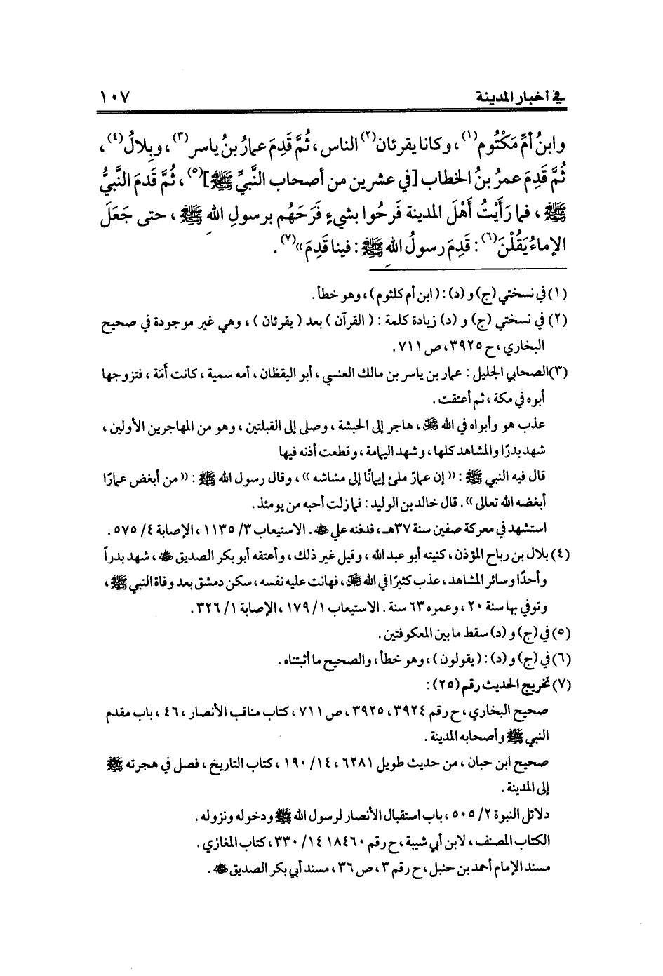 صحيح البخاري، ح رقم ٣٩٢٤، ٣٩٢٥، ص ٧١١، كتاب مناقب الأنصار، ٤٦، باب مقدم النبي الله صلى الله عليه وسلم وأصحابه المدينة.