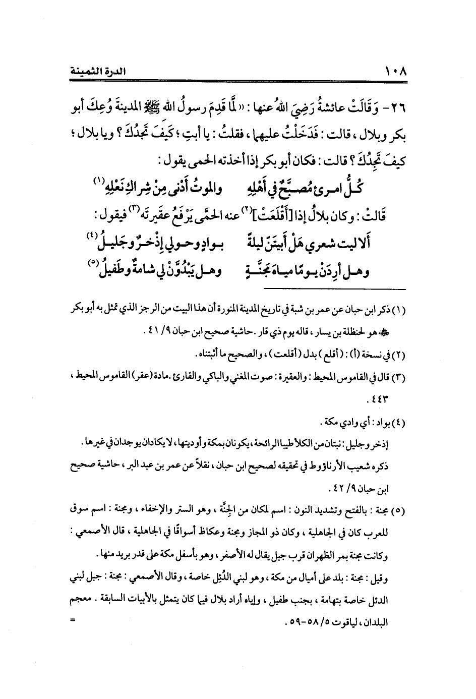 ٢٦ - وَقَالَتْ عائشةُ رَضِيَ اللهُ عنها: ((لَمَّا قَدِمَ رسولُ اللهِ - صلى الله عليه وسلم -المدينةَ وُعِكَ أبو بكر وبلال، قالت: فَدَخَلْتُ عليهما، فقلتُ: يا أبتِ؛ كَيفَ تَجدُكَ؟ ويا بلال؛ كيفَ تَجِدُكَ؟ قالت: فكان أبو بكر إذا أخذته الحمى يقول: