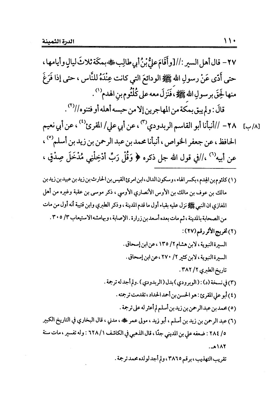 ٢٨ - //أنبأنا أبو القاسم الربدودي (¬٣)، عن أبي علي [٨/ب] المقرئ (¬٤)، عن أبي نعيم الحافظ، عن جعفر الخواص، أنبأنا محمد بن عبد الرحمن بن زيد بن أسلم (¬٥)، عن أبيه (¬٦)،// في قول الله جل ذكره {وَقُلْ رَبِّ أدْخِلْنِي مُدْخَلَ صِدْقٍ،